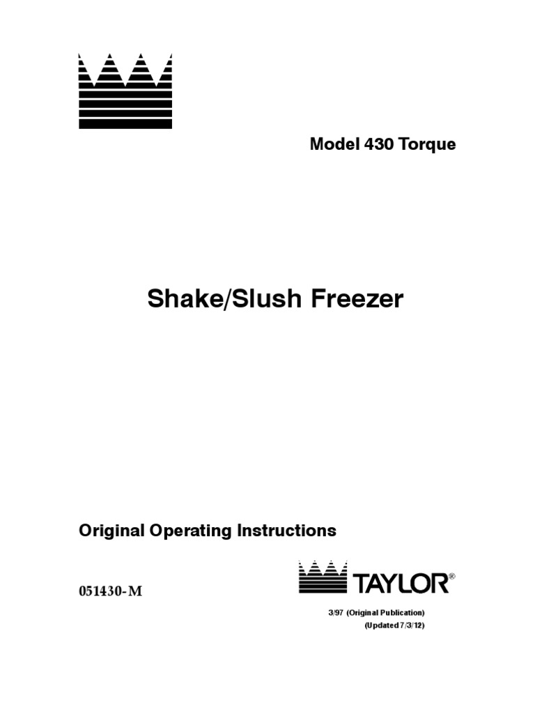 The freezer you have purchased has been carefully engineered and manufactured to give you dependable operation. The Taylor Model 430 Torque, when properly operated and cared for, will produce a consistent quality product. Like all mechanical products, they will require cleaning and maintenance. A minimum amount of care and attention is necessary if the operating procedures outlined in this manual are followed closely. This Operators Manual should be read before operating or performing any maintenance on your equipment. Your Taylor freezer will NOT eventually compensate for and correct any errors during the set--up or filling operations. Thus, the initial assembly and priming procedures are of extreme importance. It is strongly recommended that personnel responsible for the equipments operation, both assembly and disassembly, sit down together and go through these procedures in order to be properly trained and to make sure that no misunderstandings exist. In the event you should require technical assistance, please contact your local authorized Taylor Distributor. Note: Warranty is valid only if the parts are authorized Taylor parts, purchased from an authorized Taylor Distributor, and the required service work is provided by an authorized Taylor service technician. Taylor reserves the right to deny warranty claims on equipment or parts if non--approved parts or refrigerant were installed in the machine, system modifications were performed beyond factory recommendations, or it is determined that the failure was caused by neglect or abuse. Note: Constant research results in steady improvements; therefore, information in this manual is subject to change without notice.