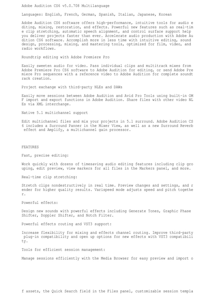 708 Multilanguage Languages: English, French, German, Spanish, Italian, Japanese, Korean Adobe Audition CS6 software offers high-performance, intuitive tools for audio e diting, mixing, restoration, and effects. Powerful new features such as real-tim e clip stretching, automatic speech alignment, and control surface support help you deliver projects faster than ever. Accelerate audio production with Adobe Au dition CS6 software. Accomplish more in less time with intuitive editing, sound design, processing, mixing, and mastering tools, optimized for film, video, and radio workflows. Roundtrip editing with Adobe Premiere Pro Easily sweeten audio for video. Pass individual clips and multitrack mixes from Adobe Premiere Pro CS6 software to Adobe Audition for editing, or send Adobe Pre miere Pro sequences with a reference video to Adobe Audition for complete soundt rack creation. Project exchange with third-party NLEs and DAWs Easily move sessions between Adobe Audition and Avid Pro Tools using built-in OM F import and export functions in Adobe Audition. Share files with other video NL Es via XML interchange. Native 5.1 multichannel support Edit multichannel files and mix your projects in 5.1 surround. Adobe Audition CS 6 includes a Surround Panner in the Mixer View, as well as a new Surround Reverb effect and Amplify, a multichannel gain processor.