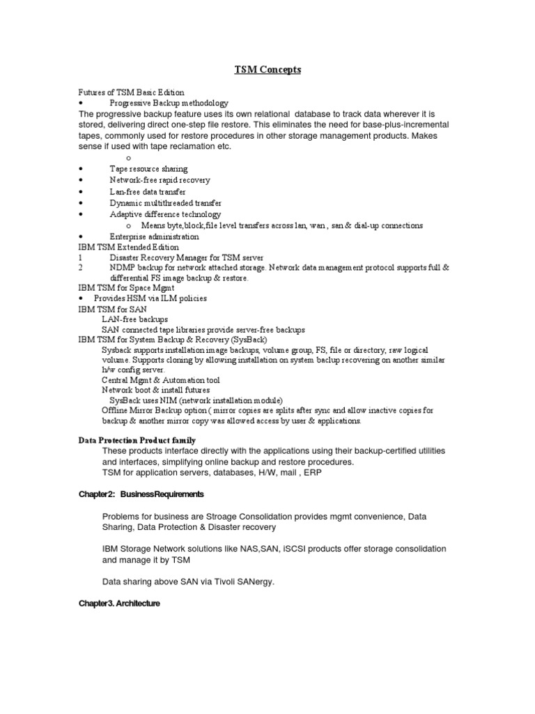 Business needs depend on many factors like govt regulations, regional demands, and industry competition. Backup and restoration requirements varies from industry to industry , dept to dept. one-fit-all doesnt suite. Backups dont matter only restore matters (good,quality,fast) from business view. TSM manages database of there logical parts. Rules & policies, files & data info and location tracking *** what u want backup & how long u want to keep it. **** first know ur data (mantra1) Qs about data: how it is created, used, accessed, & what happens it u looses the data, from this u can find how long it takes to recreated data, first of all with the inputs available can we recreate the data with out backup. If it is painful costlier or not possible t hen backup data. Understanding your customers, your environment, your business, your needs and your requirements are key to success, in storage management as well as business in general ClientArchitecture Chapter5 Backup& Restoreoperations Issues to be concerned while doing operations on client are backup & restore efficiencies, retention periods, portability, CPU utilization, connection time and network utilization. Read entire chapter good one. Chapter6 Backuparchiveclient