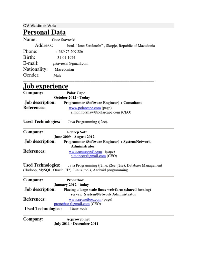 Genrep Soft June 2009 - August 2012 Job description: Programmer (Software Engineer) + System/Network Administrator References: www.genrepsoft.com (page) simoncev@gmail.com (CEO)