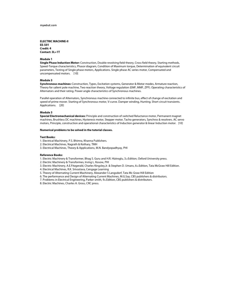 ELECTRIC MACHINE-II EE-501 Credit: 4 Contact: 3L+1T Module 1 Single Phase Induction Motor: Construction, Double revolving field theory, Cross field theory, Starting methods, Speed-Torque characteristics, Phasor diagram, Condition of Maximum torque, Determination of equivalent circuit parameters, Testing of Single phase motors, Applications. Single phase AC series motor, Compensated and uncompensated motors. [10] Module 3 Synchronous machines: Construction, Types, Excitation systems, Generator & Motor modes, Armature reaction, Theory for salient pole machine, Two reaction theory, Voltage regulation (EMF, MMF, ZPF). Operating characteristics of Alternators and their rating. Power angle characteristics of Synchronous machines. Parallel operation of Alternators, Synchronous machine connected to infinite bus, effect of change of excitation and speed of prime mover. Starting of Synchronous motor, V-curve. Damper winding, Hunting. Short circuit transients. Applications. [20] Module 3 Special Electromechanical devices: Principle and construction of switched Reluctance motor, Permanent magnet machines, Brushless DC machines, Hysteresis motor, Stepper motor, Tacho generators, Synchros & resolvers. AC servo motors, Principle, construction and operational characteristics of Induction generator & linear Induction motor. [10] Numerical problems to be solved in the tutorial classes. Text Books: 1. Electrical Machinery, P.S. Bhimra, Khanna Publishers. 2. Electrical Machines, Nagrath & Kothary, TMH 3. Electrical Machines, Theory & Applications, M.N. Bandyopadhyay, PHI Reference Books: 1. Electric Machinery & Transformer, Bhag S. Guru and H.R. Hiziroglu, 3 rd Edition, Oxford University press. 2. Electric Machinery & Transformes, Irving L. Kosow, PHI 3. Electric Machinery, A.E.Fitzgerald, Charles Kingsley,Jr. & Stephen D. Umans, 6 th Edition, Tata McGraw Hill Edition. 4. Electrical Machines, R.K. Srivastava, Cengage Learning 5. Theory of Alternating Current Machinery, Alexander S Langsdorf, Tata Mc Graw Hill Edition 6. The performance and Design of Alternating Current Machines, M.G.Say, CBS publishers & distributors. 7. Problems in Electrical Engineering, Parker smith, 9th Edition, CBS publishers & distributors. 8. Electric Machines, Charles A. Gross, CRC press.