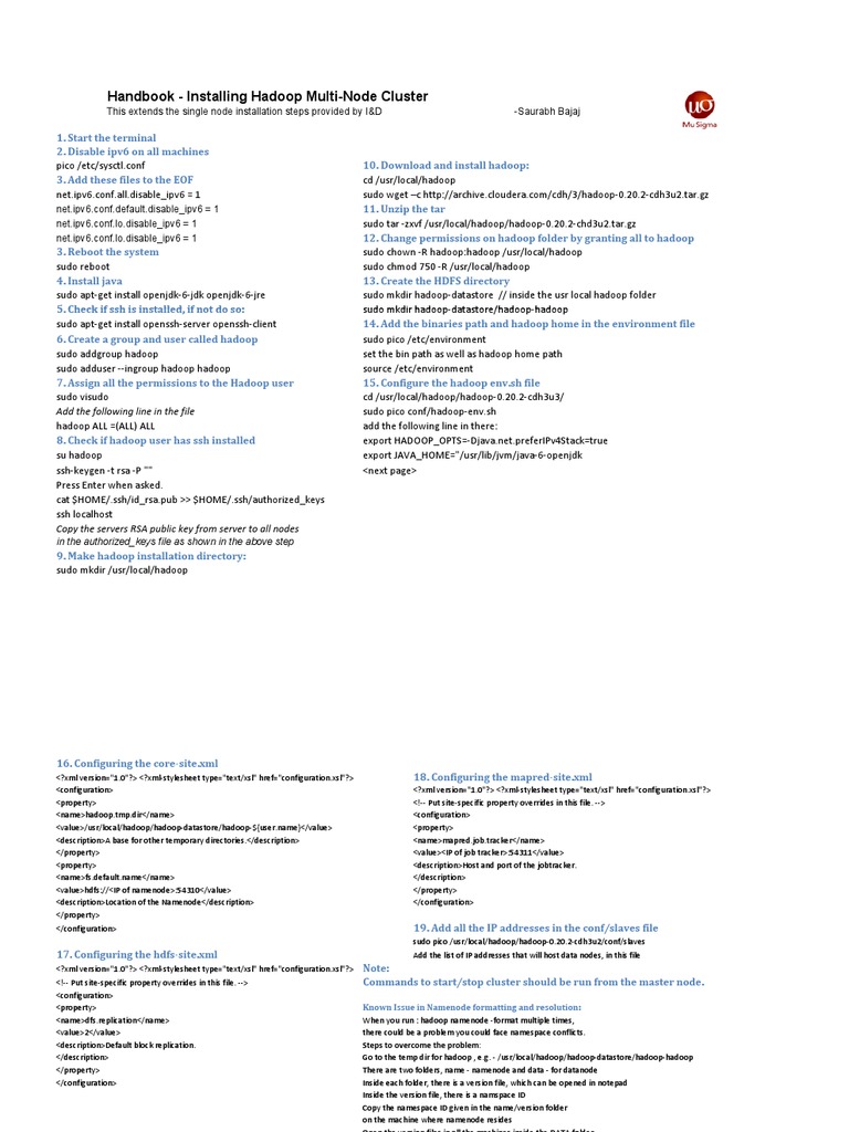 3. Reboot the system sudo reboot 4. Install java sudo apt-get install openjdk-6-jdk openjdk-6-jre 5. Check if ssh is installed, if not do so: sudo apt-get install openssh-server openssh-client 6. Create a group and user called hadoop sudo addgroup hadoop sudo adduser --ingroup hadoop hadoop 7. Assign all the permissions to the Hadoop user sudo visudo Add the following line in the file hadoop ALL =(ALL) ALL 8. Check if hadoop user has ssh installed su hadoop ssh-keygen -t rsa -P "" Press Enter when asked. cat $HOME/.ssh/id_rsa.pub >> $HOME/.ssh/authorized_keys ssh localhost Copy the servers RSA public key from server to all nodes