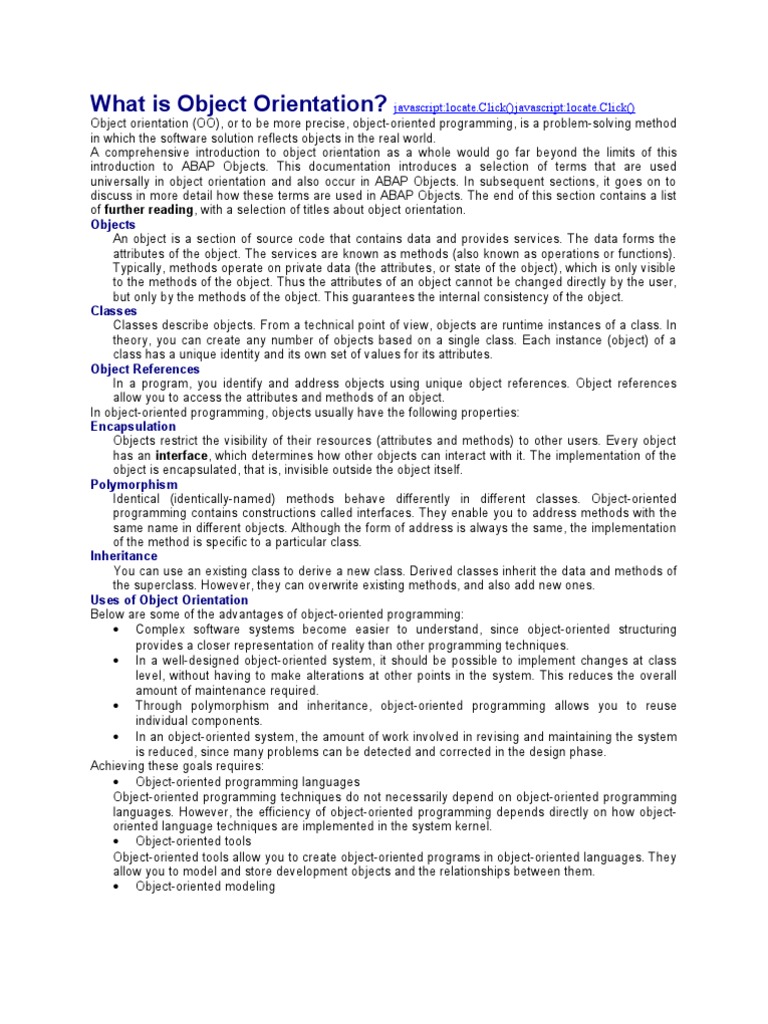 Object orientation (OO), or to be more precise, object-oriented programming, is a problem-solving method in which the software solution reflects objects in the real world. A comprehensive introduction to object orientation as a whole would go far beyond the limits of this introduction to ABAP Objects. This documentation introduces a selection of terms that are used universally in object orientation and also occur in ABAP Objects. In subsequent sections, it goes on to discuss in more detail how these terms are used in ABAP Objects. The end of this section contains a list of further reading, with a selection of titles about object orientation. Objects An object is a section of source code that contains data and provides services. The data forms the attributes of the object. The services are known as methods (also known as operations or functions). Typically, methods operate on private data (the attributes, or state of the object), which is only visible to the methods of the object. Thus the attributes of an object cannot be changed directly by the user, but only by the methods of the object. This guarantees the internal consistency of the object. Classes Classes describe objects. From a technical point of view, objects are runtime instances of a class. In theory, you can create any number of objects based on a single class. Each instance (object) of a class has a unique identity and its own set of values for its attributes. Object References In a program, you identify and address objects using unique object references. Object references allow you to access the attributes and methods of an object. In object-oriented programming, objects usually have the following properties: Encapsulation Objects restrict the visibility of their resources (attributes and methods) to other users. Every object has an interface, which determines how other objects can interact with it. The implementation of the object is encapsulated, that is, invisible outside the object itself. Polymorphism Identical (identically-named) methods behave differently in different classes. Object-oriented programming contains constructions called interfaces. They enable you to address methods with the same name in different objects. Although the form of address is always the same, the implementation of the method is specific to a particular class. Inheritance You can use an existing class to derive a new class. Derived classes inherit the data and methods of the superclass. However, they can overwrite existing methods, and also add new ones. Uses of Object Orientation Below are some of the advantages of object-oriented programming: Complex software systems become easier to understand, since object-oriented structuring provides a closer representation of reality than other programming techniques. In a well-designed object-oriented system, it should be possible to implement changes at class level, without having to make alterations at other points in the system. This reduces the overall amount of maintenance required. Through polymorphism and inheritance, object-oriented programming allows you to reuse individual components. In an object-oriented system, the amount of work involved in revising and maintaining the system is reduced, since many problems can be detected and corrected in the design phase. Achieving these goals requires: Object-oriented programming languages Object-oriented programming techniques do not necessarily depend on object-oriented programming languages. However, the efficiency of object-oriented programming depends directly on how objectoriented language techniques are implemented in the system kernel. Object-oriented tools Object-oriented tools allow you to create object-oriented programs in object-oriented languages. They allow you to model and store development objects and the relationships between them. Object-oriented modeling