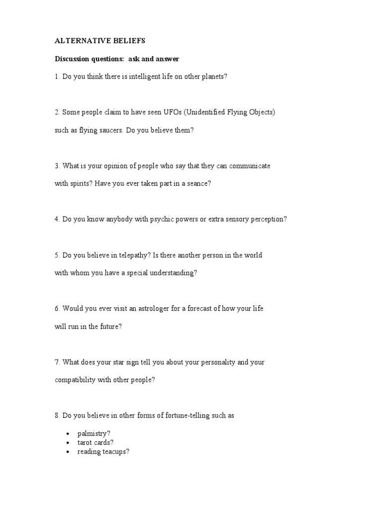 ALTERNATIVE BELIEFS Discussion questions:_ask and answer 1. Do you think there is intelligent life on other planets?