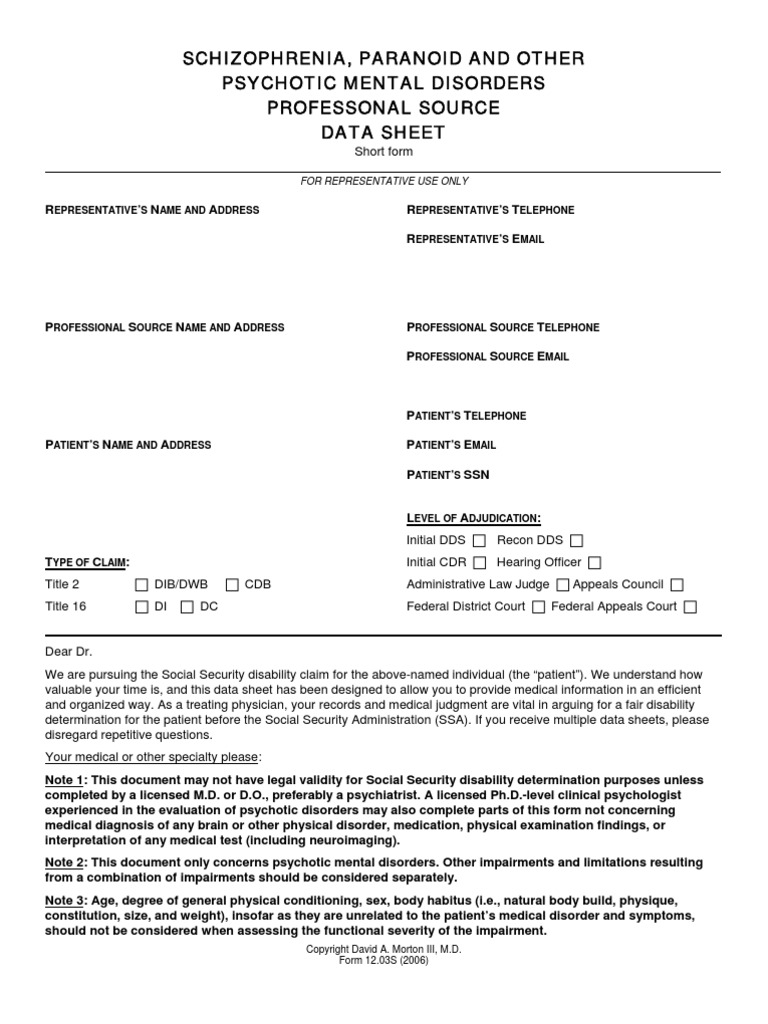 Dear Dr. We are pursuing the Social Security disability claim for the above-named individual (the patient). We understand how valuable your time is, and this data sheet has been designed to allow you to provide medical information in an efficient and organized way. As a treating physician, your records and medical judgment are vital in arguing for a fair disability determination for the patient before the Social Security Administration (SSA). If you receive multiple data sheets, please disregard repetitive questions. Your medical or other specialty please: Note 1: This document may not have legal validity for Social Security disability determination purposes unless completed by a licensed M.D. or D.O., preferably a psychiatrist. A licensed Ph.D.-level clinical psychologist experienced in the evaluation of psychotic disorders may also complete parts of this form not concerning medical diagnosis of any brain or other physical disorder, medication, physical examination findings, or interpretation of any medical test (including neuroimaging). Note 2: This document only concerns psychotic mental disorders. Other impairments and limitations resulting from a combination of impairments should be considered separately. Note 3: Age, degree of general physical conditioning, sex, body habitus (i.e., natural body build, physique, constitution, size, and weight), insofar as they are unrelated to the patients medical disorder and symptoms, should not be considered when assessing the functional severity of the impairment.