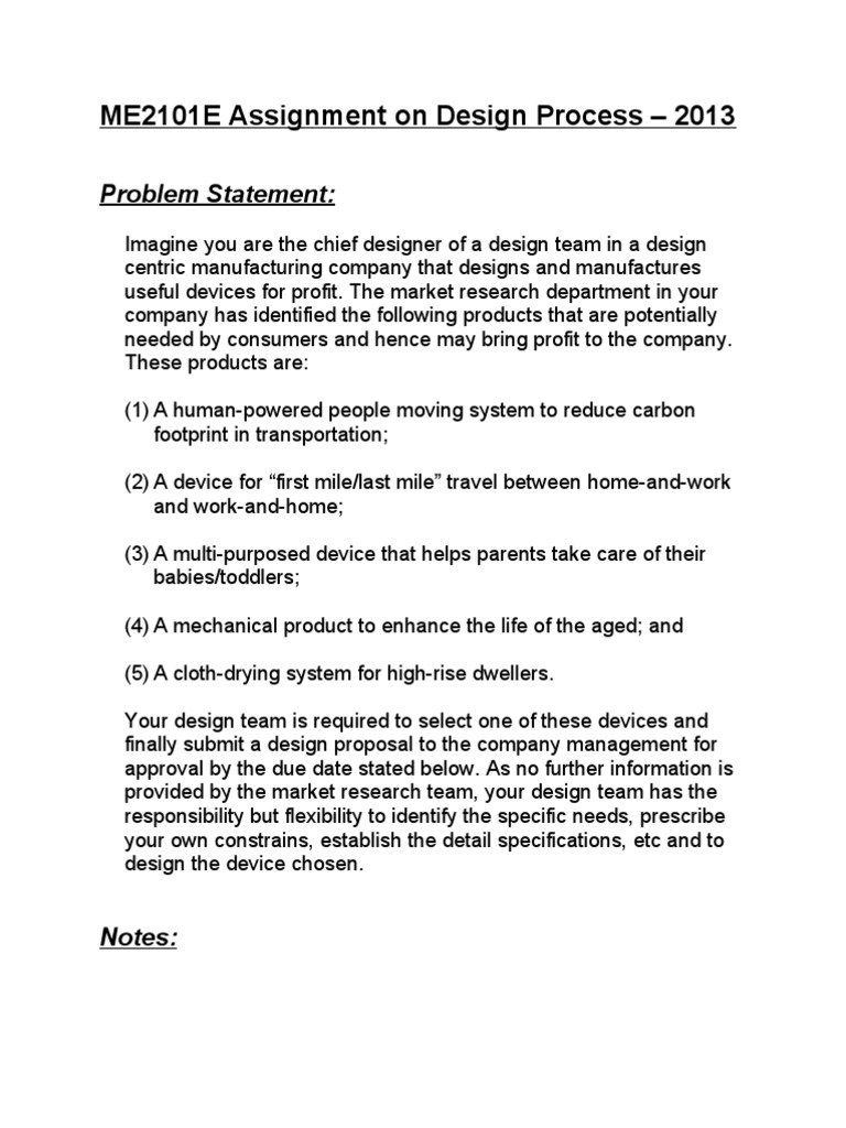 Imagine you are the chief designer of a design team in a design centric manufacturing company that designs and manufactures useful devices for profit. The market research department in your company has identified the following products that are potentially needed by consumers and hence may bring profit to the company. These products are: (1) A human-powered people moving system to reduce carbon footprint in transportation; (2) A device for first mile/last mile travel between home-and-work and work-and-home; (3) A multi-purposed device that helps parents take care of their babies/toddlers; (4) A mechanical product to enhance the life of the aged; and (5) A cloth-drying system for high-rise dwellers. Your design team is required to select one of these devices and finally submit a design proposal to the company management for approval by the due date stated below. As no further information is provided by the market research team, your design team has the responsibility but flexibility to identify the specific needs, prescribe your own constrains, establish the detail specifications, etc and to design the device chosen.