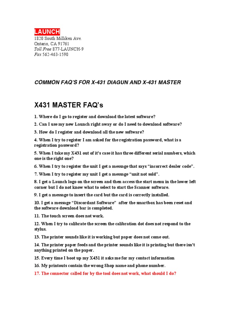 1. Where do I go to register and download the latest software? 2. Can I use my new Launch right away or do I need to download software? 3. How do I register and download all the new software? 4. When I try to register I am asked for the registration password, what is a registration password? 5. When I take my X431 out of it's case it has three different serial numbers, which one is the right one? 6. When I try to register the unit I get a message that says incorrect dealer code. 7. When I try to register my unit I get a message unit not sold. 8. I get a Launch logo on the screen and then access the start menu in the lower left corner but I do not know what to select to start the Scanner software. 9. I get a message to insert the card but the card is correctly installed. 10. I get a message Discordant Software after the smartbox has been reset and the software download bar is completed. 11. The touch screen does not work. 12. When I try to calibrate the screen the calibration dot does not respond to the stylus. 13. The printer sounds like it is working but paper does not come out. 14. The printer paper feeds and the printer sounds like it is printing but there isn't anything printed on the paper. 15. Every time I boot up my X431 it asks me for my contact information 16. My printouts contain the wrong Shop name and phone number. 17. The connector called for by the tool does not work, what should I do?