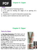 Structure of Zippers Zippers can be divided into three major parts: the tape, the teeth and the slider. Slider: The slider joins or separates the teeth, also known as elements, when the zipper is opened or closed. Depending on their use, various types of sliders are available in the market. Teeth: The teeth, also known as elements, are the parts on each side of a zipper that mesh, or engage, with each other when passed through the slider. When the left and the right side teeth are engaged, they are called chain. Tape: The tape is manufactured exclusively for zippers. It is usually made of polyester, but synthetic fiber tape, vinyl tape and cotton tape are also available to be used for specific purpose zippers. Types of Zippers There are a variety of zippers available in the market. All the zippers, however, are chiefly manufactured from three types of materials- Metal Chain; Molded Plastic Chain; and Coil (Nylon) Chain. These chains can be used to make various kinds of zippers. Bag Type Zipper:It has a single slider which moves in one way only, used mainly in pants, purses, tents, etc.