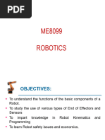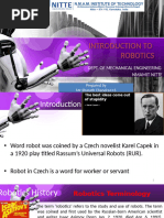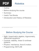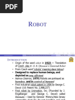 The term robot was rst introduced into our vocabulary by the Czech playwright Karel Capek in his 1920 play Rossums Universal Robots, the word robota being the Czech word for work. Since then the term has been applied to a great variety of mechanical devices, such as teleoperators, underwater vehicles, autonomous land rovers, etc. Virtually anything that operates with some degree of autonomy, usually under computer control, has at some point been called a robot. In this text the term robot will mean a computer controlled industrial manipulator of the type shown in Figure 1.1. This type of robot is essentially a mechanical arm operating under computer control. Such devices, though far from the robots of science ction, are nevertheless extremely complex electro-mechanical systems whose analytical description requires advanced methods, and which present many challenging and interesting research problems.
