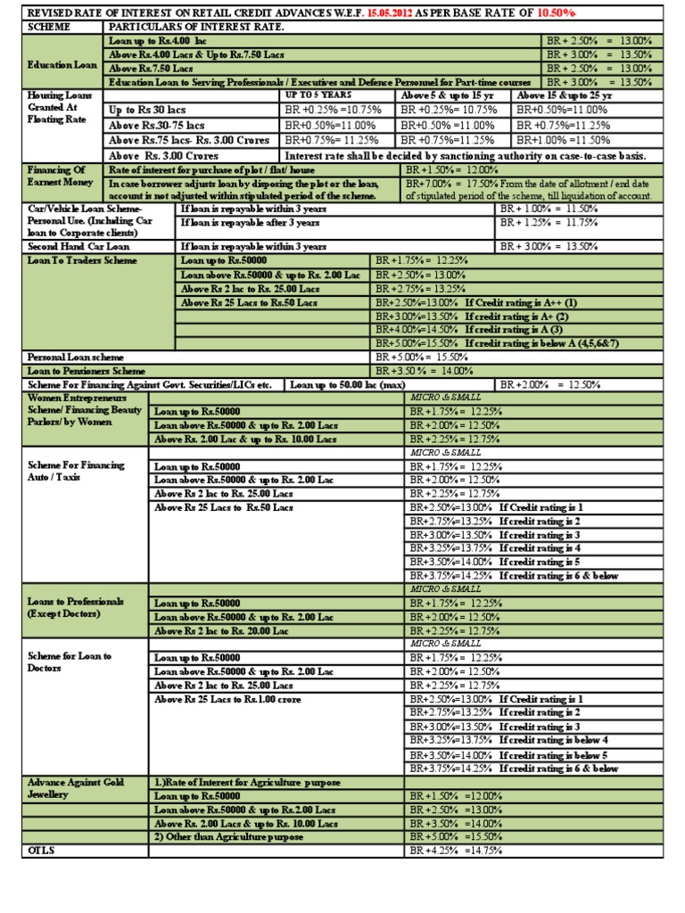 REVISED RATE OF INTEREST ON RETAIL CREDIT ADVANCES W.E.F. 15.05.2012 AS PER BASE RATE OF 10.50%SCHEME PARTICULARS OF INTEREST RATE.