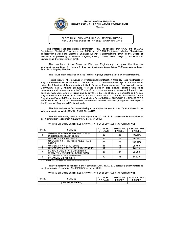 SEPTEMBER 2013 REGISTERED ELECTRICAL ENGINEER Licensure Examination are the