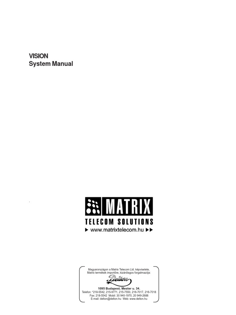 The ideal sales package for Vision is as mentioned below: EPABX Vision-206S/207P/308S/309P Sr. Item Qty. 01 EPABX Vision 1 02 System Manual 1 03 User's Guide 1 04 Vision Quick Start 2 05 Vision Programming Card 1 06 Fuse FB 2.5 Amp. 1 07 Fuse FB 3.5 Amp. 1 08 Battery Cable 1 09 T. P. G. 1 10 Screw Grip 2 11 Screw M 7 X 30 2 12 Warranty Card Set 1 13 Support Card 1 14 Matrix Logo Small 5 15 Telephone Message Pad 1 16 Label Factory Seal 1 17 Mounting Template 1 Ducumentation CD (System Manual, User's 18 1 Guide and Quick Start) Please make sure that these components are present. In case of short supply or damage detection, contact the source for where you have purchased the system.