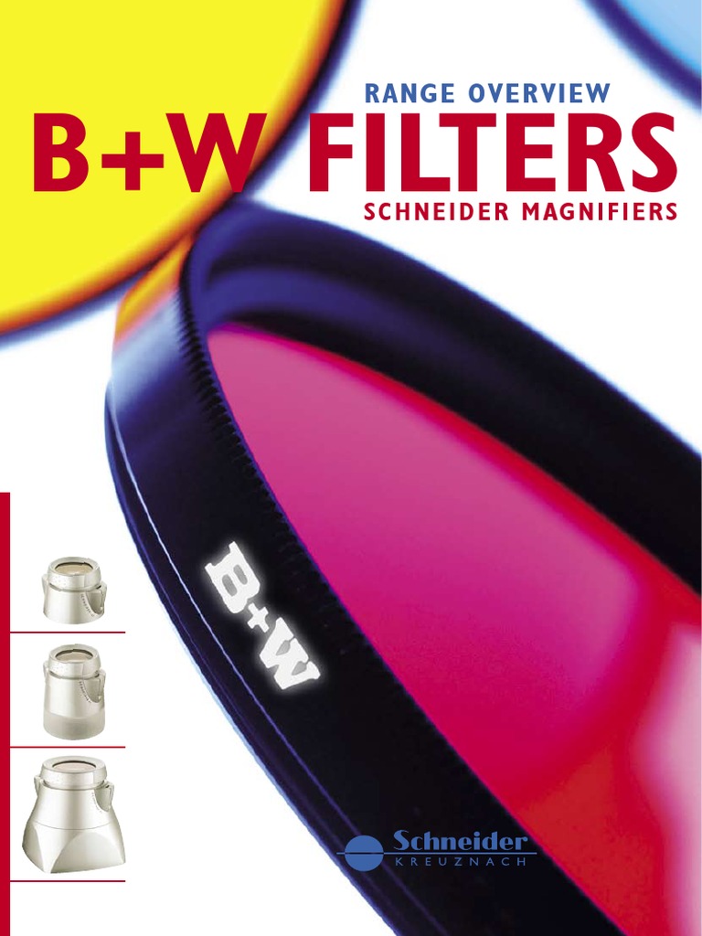 The B+W filter range also includes CC filters for professional applications in the subtractive primary colors of cyan, magenta and yellow and in the additive primary colors of red, green and blue, in each case in four density steps of 05, 0, 20 and 40. More information can be found in the B+W Filter Handbook; the available sizes and mounts can be found in the tables on pages 2 to 4 of this brochure.