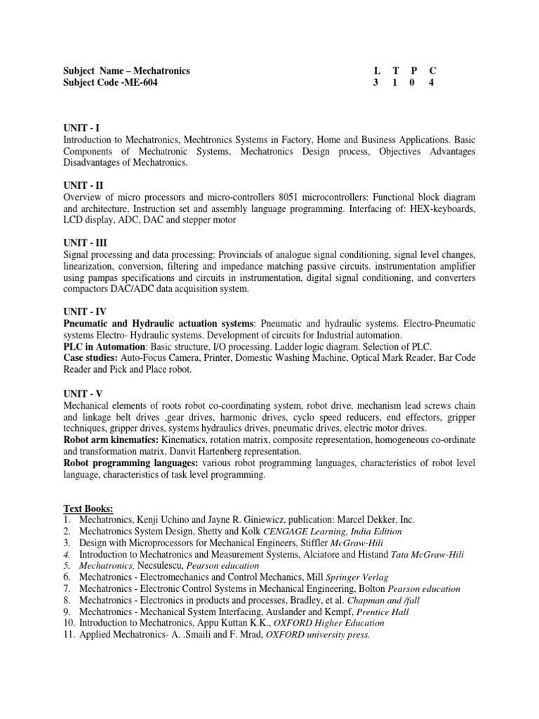 UNIT - I Introduction to Mechatronics, Mechtronics Systems in Factory, Home and Business Applications. Basic Components of Mechatronic Systems, Mechatronics Design process, Objectives Advantages Disadvantages of Mechatronics. UNIT - II Overview of micro processors and micro-controllers 8051 microcontrollers: Functional block diagram and architecture, Instruction set and assembly language programming. Interfacing of: HEX-keyboards, LCD display, ADC, DAC and stepper motor UNIT - III Signal processing and data processing: Provincials of analogue signal conditioning, signal level changes, linearization, conversion, filtering and impedance matching passive circuits. instrumentation amplifier using pampas specifications and circuits in instrumentation, digital signal conditioning, and converters compactors DAC/ADC data acquisition system. UNIT - IV Pneumatic and Hydraulic actuation systems: Pneumatic and hydraulic systems. Electro-Pneumatic systems Electro- Hydraulic systems. Development of circuits for Industrial automation. PLC in Automation: Basic structure, I/O processing. Ladder logic diagram. Selection of PLC. Case studies: Auto-Focus Camera, Printer, Domestic Washing Machine, Optical Mark Reader, Bar Code Reader and Pick and Place robot. UNIT - V Mechanical elements of roots robot co-coordinating system, robot drive, mechanism lead screws chain and linkage belt drives ,gear drives, harmonic drives, cyclo speed reducers, end effectors, gripper techniques, gripper drives, systems hydraulics drives, pneumatic drives, electric motor drives. Robot arm kinematics: Kinematics, rotation matrix, composite representation, homogeneous co-ordinate and transformation matrix, Danvit Hartenberg representation. Robot programming languages: various robot programming languages, characteristics of robot level language, characteristics of task level programming. Text Books: 1. Mechatronics, Kenji Uchino and Jayne R. Giniewicz, publication: Marcel Dekker, Inc. 2. Mechatronics System Design, Shetty and Kolk CENGAGE Learning, India Edition 3. Design with Microprocessors for Mechanical Engineers, Stiffler McGraw-Hili 4. Introduction to Mechatronics and Measurement Systems, Alciatore and Histand Tata McGraw-Hili 5. Mechatronics, Necsulescu, Pearson education 6. Mechatronics - Electromechanics and Control Mechanics, Mill Springer Verlag 7. Mechatronics - Electronic Control Systems in Mechanical Engineering, Bolton Pearson education 8. Mechatronics - Electronics in products and processes, Bradley, et al. Chapman and /fall 9. Mechatronics - Mechanical System Interfacing, Auslander and Kempf, Prentice Hall 10. Introduction to Mechatronics, Appu Kuttan K.K., OXFORD Higher Education 11. Applied Mechatronics- A. .Smaili and F. Mrad, OXFORD university press.