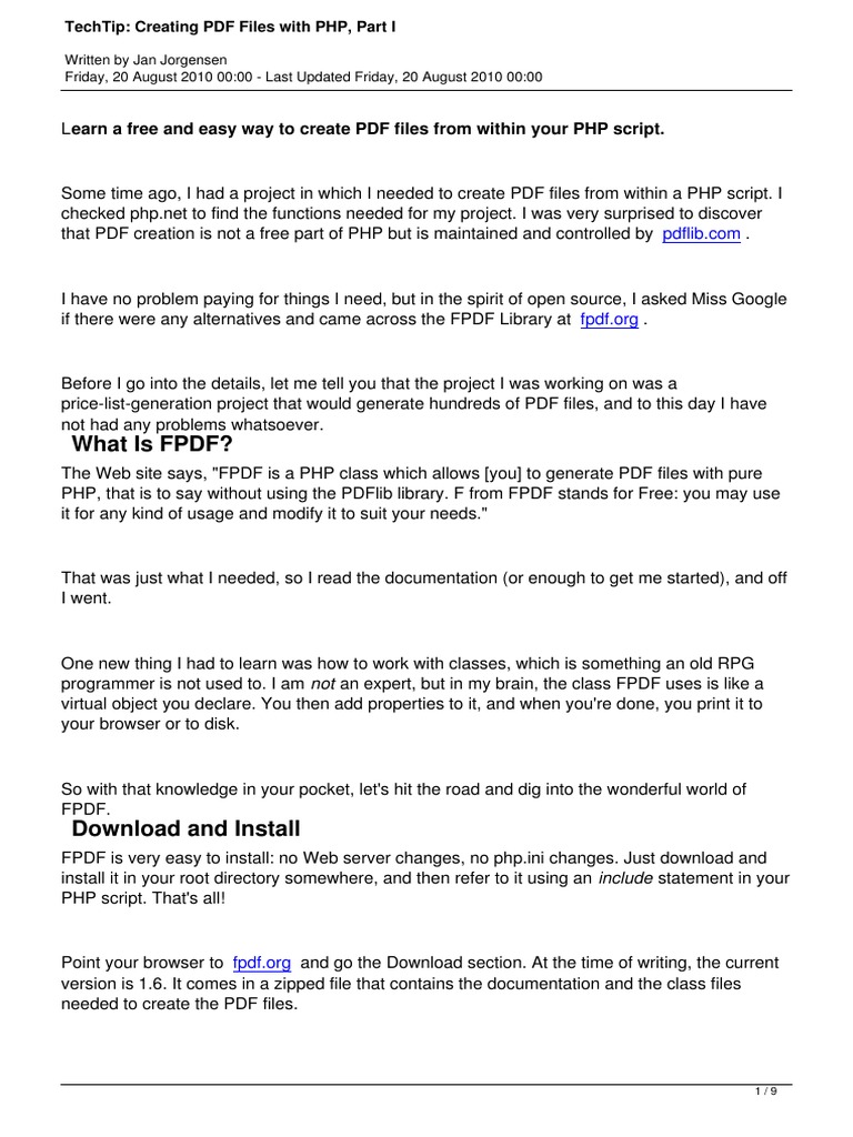 L earn a free and easy way to create PDF files from within your PHP script. Some time ago, I had a project in which I needed to create PDF files from within a PHP script. I checked php.net to find the functions needed for my project. I was very surprised to discover that PDF creation is not a free part of PHP but is maintained and controlled by pdflib.com . I have no problem paying for things I need, but in the spirit of open source, I asked Miss Google if there were any alternatives and came across the FPDF Library at fpdf.org . Before I go into the details, let me tell you that the project I was working on was a price-list-generation project that would generate hundreds of PDF files, and to this day I have not had any problems whatsoever.