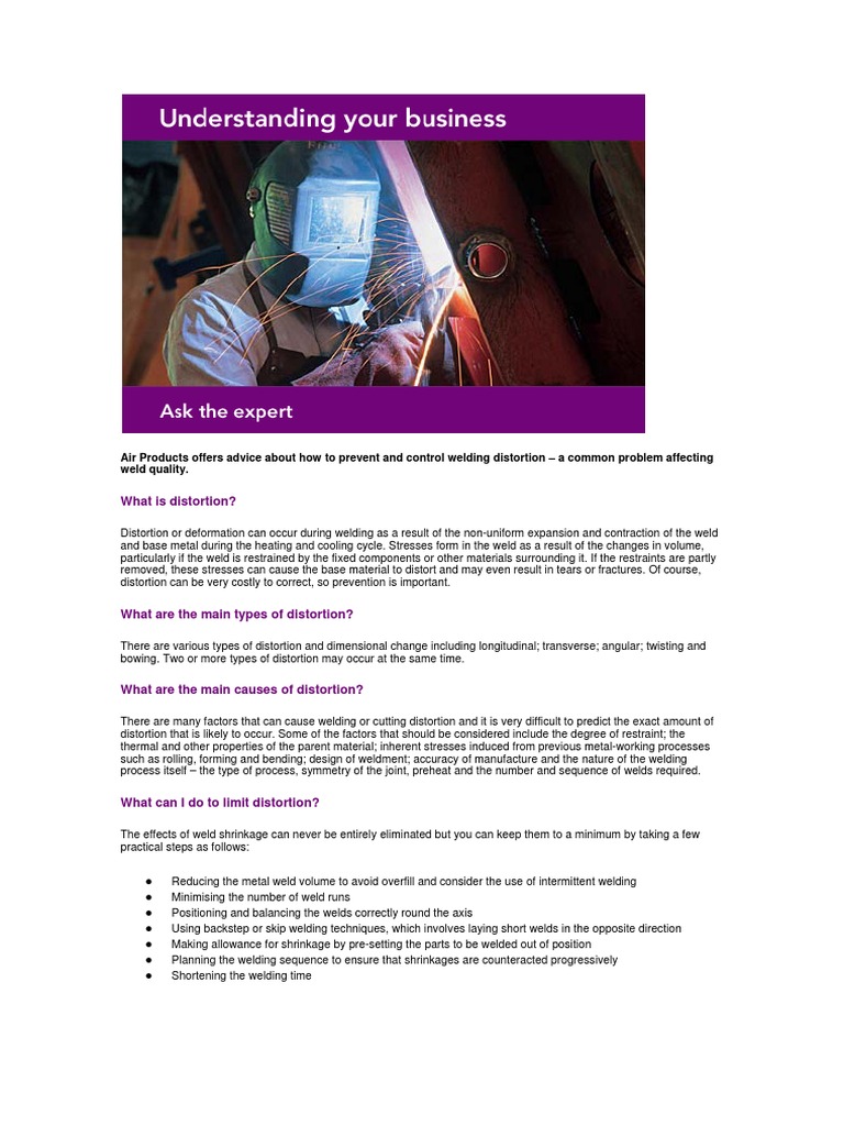 Air Products offers advice about how to prevent and control welding distortion a common problem affecting weld