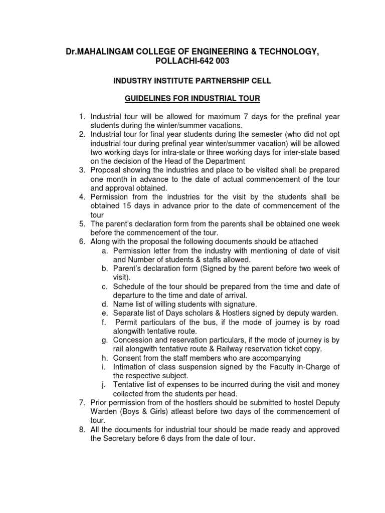 INDUSTRY INSTITUTE PARTNERSHIP CELL GUIDELINES FOR INDUSTRIAL TOUR 1. Industrial tour will be allowed for maximum 7 days for the prefinal year students during the winter/summer vacations. 2. Industrial tour for final year students during the semester (who did not opt industrial tour during prefinal year winter/summer vacation) will be allowed two working days for intra-state or three working days for inter-state based on the decision of the Head of the Department 3. Proposal showing the industries and place to be visited shall be prepared one month in advance to the date of actual commencement of the tour and approval obtained. 4. Permission from the industries for the visit by the students shall be obtained 15 days in advance prior to the date of commencement of the tour 5. The parents declaration form from the parents shall be obtained one week before the commencement of the tour. 6. Along with the proposal the following documents should be attached a. Permission letter from the industry with mentioning of date of visit and Number of students & staffs allowed. b. Parents declaration form (Signed by the parent before two week of visit). c. Schedule of the tour should be prepared from the time and date of departure to the time and date of arrival. d. Name list of willing students with signature. e. Separate list of Days scholars & Hostlers signed by deputy warden. f. Permit particulars of the bus, if the mode of journey is by road alongwith tentative route. g. Concession and reservation particulars, if the mode of journey is by rail alongwith tentative route & Railway reservation ticket copy. h. Consent from the staff members who are accompanying i. Intimation of class suspension signed by the Faculty in-Charge of the respective subject. j. Tentative list of expenses to be incurred during the visit and money collected from the students per head. 7. Prior permission from of the hostlers should be submitted to hostel Deputy Warden (Boys & Girls) atleast before two days of the commencement of tour. 8. All the documents for industrial tour should be made ready and approved the Secretary before 6 days from the date of tour.