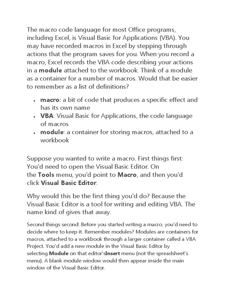 macro: a bit of code that produces a specific effect and has its own name VBA: Visual Basic for Applications, the code language of macros module: a container for storing macros, attached to a workbook