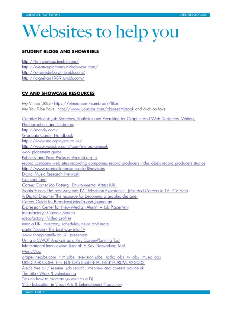 STUDENT BLOGS AND SHOWREELS http://jonnybriggs.tumblr.com/ http://creativeplatforms.nickdownie.com/ http://oliveredinburgh.tumblr.com/ http://algrehan1989.tumblr.com/ CV AND SHOWCASE RESOURCES My Vimeo LIKES - https://vimeo.com/sambrook/likes My You Tube Favs - http://www.youtube.com/clairesambrook and click on favs Creative Hotlist: Job Searches, Portfolios and Recruiting for Graphic and Web Designers, Writers, Photographers and Illustrators http://mandy.com/ Graduate Career Handbook http://www.majorplayers.co.uk/ http://www.youtube.com/user/majorplayersuk work placement guide Publicity and Press Packs at Vocalist.org.uk record company web sites recording companies record producers indie labels record producers studios http://www.productionbase.co.uk/film-tv-jobs Digital Music Research Network Concept farm Career Corner Job Posting - Environmental Artists (UK) StartinTV.com The best way into TV - Television Experience - Jobs and Careers in TV - CV Help A Digital Dreamer The resource for becoming a graphic designer Career Guide for Broadcast Media and Journalism Expression Center for New Media - Alumni + Job Placement ideasfactory - Careers Search ideasfactory - Video profiles Media UK - directory, schedules, news and more startinTV.com - The best way into TV www.shoppingtelly.co.uk - presenters Using a SWOT Analysis as a Key Career-Planning Tool Informational Interviewing Tutorial: A Key Networking Tool MusicMoz grapevinejobs.com - film jobs - television jobs - radio jobs - tv jobs - music jobs UKEDITOR.COM. THE EDITORS ESSENTIAL HELP FORUM. 2002 Alec's free cv / resume, job search, interview and careers advice uk The Site - Work & volunteering Tips on how to promote yourself as a DJ VFS - Education in Visual Arts & Entertainment Production