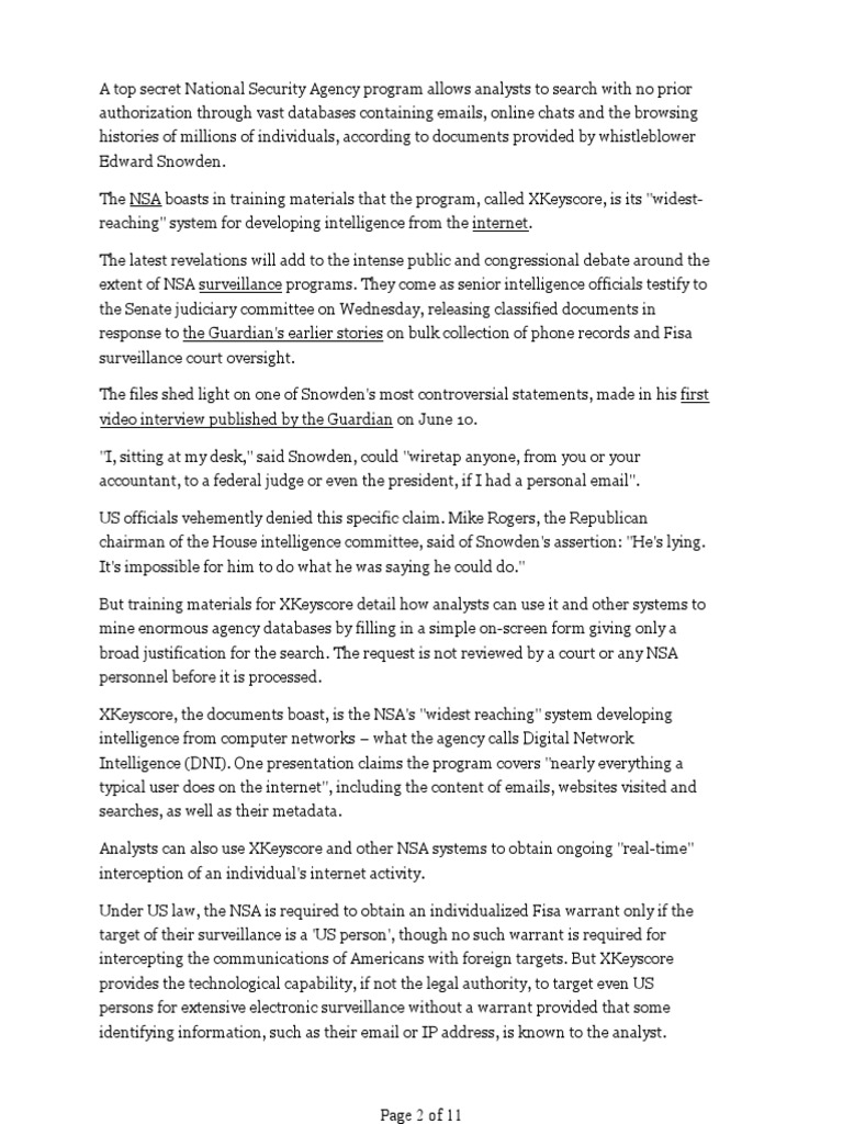 containing emails, online chats and the browsing histories of millions of individuals, according to documents provided by whistleblower Edward Snowden. The NSA boasts in training materials that the program, called XKeyscore, is its "widestreaching" system for developing intelligence from the internet. The latest revelations will add to the intense public and congressional debate around the extent of NSA surveillance programs. They come as senior intelligence officials testify to the Senate judiciary committee on Wednesday, releasing classified documents in response to the Guardian's earlier stories on bulk collection of phone records and Fisa surveillance court oversight. The files shed light on one of Snowden's most controversial statements, made in his first video interview published by the Guardian on June 10. "I, sitting at my desk," said Snowden, could "wiretap anyone, from you or your accountant, to a federal judge or even the president, if I had a personal email". US officials vehemently denied this specific claim. Mike Rogers, the Republican chairman of the House intelligence committee, said of Snowden's assertion: "He's lying. It's impossible for him to do what he was saying he could do." But training materials for XKeyscore detail how analysts can use it and other systems to mine enormous agency databases by filling in a simple on-screen form giving only a broad justification for the search. The request is not reviewed by a court or any NSA personnel before it is processed. XKeyscore, the documents boast, is the NSA's "widest reaching" system developing intelligence from computer networks what the agency calls Digital Network Intelligence (DNI). One presentation claims the program covers "nearly everything a typical user does on the internet", including the content of emails, websites visited and searches, as well as their metadata. Analysts can also use XKeyscore and other NSA systems to obtain ongoing "real-time" interception of an individual's internet activity. Under US law, the NSA is required to obtain an individualized Fisa warrant only if the target of their surveillance is a 'US person', though no such warrant is required for intercepting the communications of Americans with foreign targets. But XKeyscore provides the technological capability, if not the legal authority, to target even US persons for extensive electronic surveillance without a warrant provided that some identifying information, such as their email or IP address, is known to the analyst.