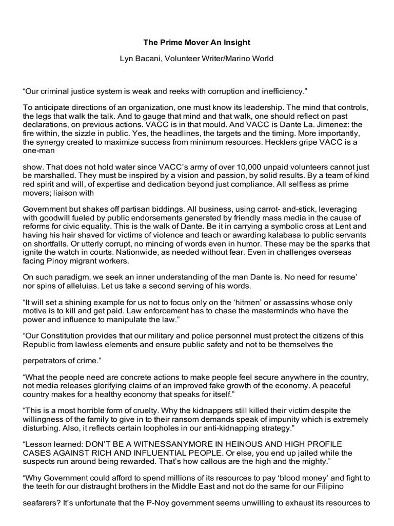 Our criminal justice system is weak and reeks with corruption and inefficiency. To anticipate directions of an organization, one must know its leadership. The mind that controls, the legs that walk the talk. And to gauge that mind and that walk, one should reflect on past declarations, on previous actions. VACC is in that mould. And VACC is Dante La. Jimenez: the fire within, the sizzle in public. Yes, the headlines, the targets and the timing. More importantly, the synergy created to maximize success from minimum resources. Hecklers gripe VACC is a one-man show. That does not hold water since VACCs army of over 10,000 unpaid volunteers cannot just be marshalled. They must be inspired by a vision and passion, by solid results. By a team of kind red spirit and will, of expertise and dedication beyond just compliance. All selfless as prime movers; liaison with Government but shakes off partisan biddings. All business, using carrot- and-stick, leveraging with goodwill fueled by public endorsements generated by friendly mass media in the cause of reforms for civic equality. This is the walk of Dante. Be it in carrying a symbolic cross at Lent and having his hair shaved for victims of violence and teach or awarding kalabasa to public servants on shortfalls. Or utterly corrupt, no mincing of words even in humor. These may be the sparks that ignite the watch in courts. Nationwide, as needed without fear. Even in challenges overseas facing Pinoy migrant workers. On such paradigm, we seek an inner understanding of the man Dante is. No need for resume nor spins of alleluias. Let us take a second serving of his words. It will set a shining example for us not to focus only on the hitmen or assassins whose only motive is to kill and get paid. Law enforcement has to chase the masterminds who have the power and influence to manipulate the law. Our Constitution provides that our military and police personnel must protect the citizens of this Republic from lawless elements and ensure public safety and not to be themselves the perpetrators of crime. What the people need are concrete actions to make people feel secure anywhere in the country, not media releases glorifying claims of an improved fake growth of the economy. A peaceful country makes for a healthy economy that speaks for itself. This is a most horrible form of cruelty. Why the kidnappers still killed their victim despite the willingness of the family to give in to their ransom demands speak of impunity which is extremely disturbing. Also, it reflects certain loopholes in our anti-kidnapping strategy. Lesson learned: DONT BE A WITNESSANYMORE IN HEINOUS AND HIGH PROFILE CASES AGAINST RICH AND INFLUENTIAL PEOPLE. Or else, you end up jailed while the suspects run around being rewarded. Thats how callous are the high and the mighty. Why Government could afford to spend millions of its resources to pay blood money and fight to the teeth for our distraught brothers in the Middle East and not do the same for our Filipino seafarers? Its unfortunate that the P-Noy government seems unwilling to exhaust its resources to