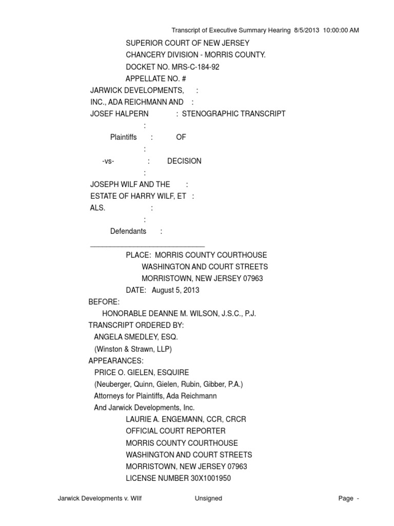 SUPERIOR COURT OF NEW JERSEY CHANCERY DIVISION - MORRIS COUNTY. DOCKET NO. MRS-C-184-92 APPELLATE NO. # JARWICK DEVELOPMENTS, INC., ADA REICHMANN AND JOSEF HALPERN : Plaintiffs : -vs: JOSEPH WILF AND THE ALS. : Defendants : _____________________________ PLACE: MORRIS COUNTY COURTHOUSE WASHINGTON AND COURT STREETS MORRISTOWN, NEW JERSEY 07963 DATE: August 5, 2013 BEFORE: HONORABLE DEANNE M. WILSON, J.S.C., P.J. TRANSCRIPT ORDERED BY: ANGELA SMEDLEY, ESQ. (Winston & Strawn, LLP) APPEARANCES: PRICE O. GIELEN, ESQUIRE (Neuberger, Quinn, Gielen, Rubin, Gibber, P.A.) Attorneys for Plaintiffs, Ada Reichmann And Jarwick Developments, Inc. LAURIE A. ENGEMANN, CCR, CRCR OFFICIAL COURT REPORTER MORRIS COUNTY COURTHOUSE WASHINGTON AND COURT STREETS MORRISTOWN, NEW JERSEY 07963 LICENSE NUMBER 30X1001950