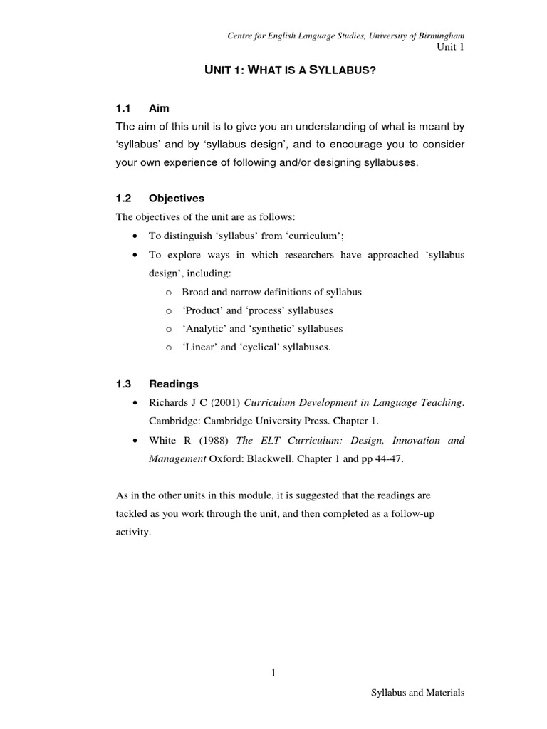 The objectives of the unit are as follows: To distinguish syllabus from curriculum; To explore ways in which researchers have approached syllabus design, including: o Broad and narrow definitions of syllabus o Product and process syllabuses o Analytic and synthetic syllabuses o Linear and cyclical syllabuses.