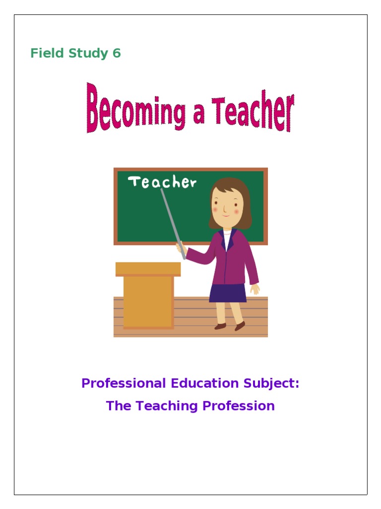Course Description This course design to complement the professional education subject, the Teaching Profession it shall bring about real life and vicarious experiences of a prospective teacher with emphasis on the characteristics of a teacher as a person and as a professional. It shall provide a wide range of opportunity or self-reflection that will better prepare you become a student teacher. Field Study 6 is anchored on this professional Education subject. The Teaching Profession. GENERAL OBJECTIVES 1. Describe the characteristics of a teacher as a person. 2. Identify the characteristics that make up a professional teacher in the classroom, in the community, and in the world. 3. Document best practices of outstanding teachers. 4. Clarify ones personal values, attitudes, and beliefs about teaching. NCBTS Personal Growth and Professional Development COMPETENCIES/ PERFORMANCE INDICATOR Articulates and demonstrates ones personal philosophy of teaching Manifests personal qualities such as enthusiasm flexibility and caring Links with other institutions, organizations for sharing best practices Clarifies own values and philosophy to be a positive role model to students Makes the physical environment safe and conducive to learning Determines, understands, and accepts the learners diverse backgrounds and experience Facilitates learning of diverse types of learners to diverse types of learning environment.