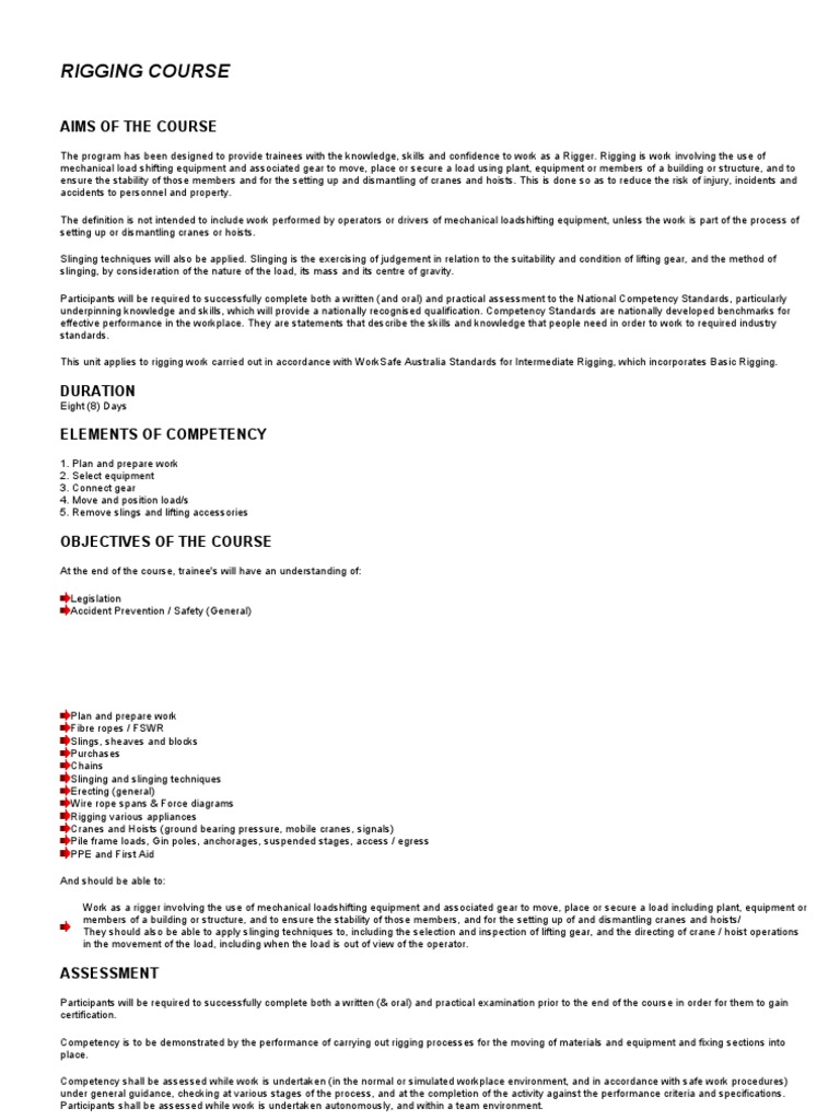 On completion of the training course the trainee should be capable of: *Identifying and selecting the correct wire, rope or chain for the task in hand *Inspecting wire rope and chain slings *Calculations involved in Rigging *The safety precautions when lifting heavy objects or off centre lifts *Transferring loads and using special lifting attachments *Using winches and snatch blocks