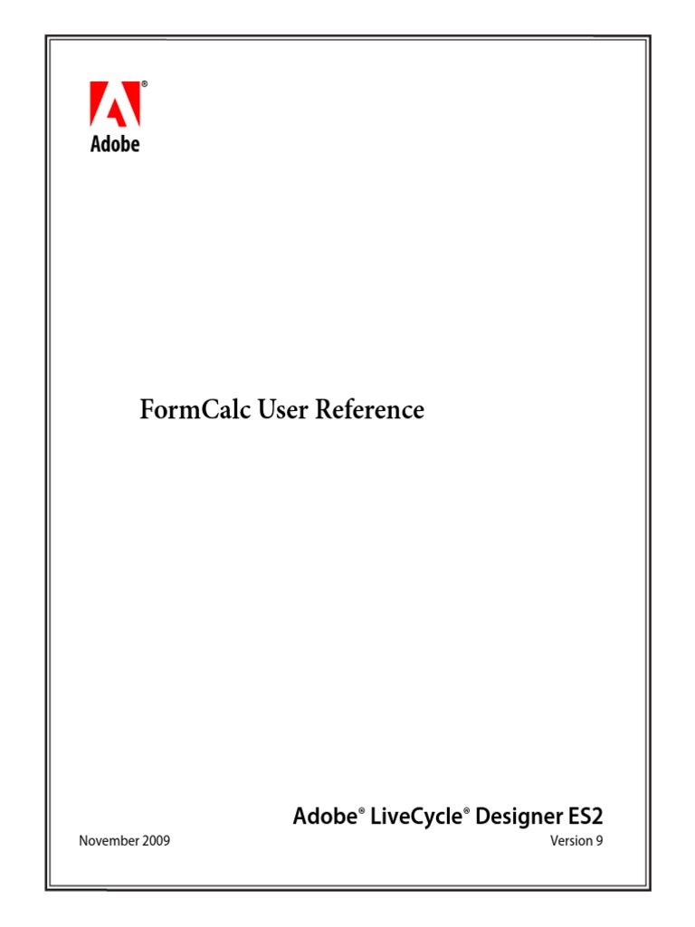 2009 Adobe Systems Incorporated. All rights reserved. Adobe LiveCycle Designer ES2 (9.0) FormCalc User Reference for Microsoft Windows Edition 4.0, November 2009 This reference guide is licensed for use under the terms of the Creative Commons Attribution Non-Commercial 3.0 License. This License allows users to copy, distribute, and transmit the guide for noncommercial purposes only so long as (1) proper attribution to Adobe is given as the owner of the guide; and (2) any reuse or distribution of the guide contains a notice that use of the guide is governed by these terms. The best way to provide notice is to include the following link. To view a copy of this license, visit http://creativecommons.org/licenses/by-nc-sa/3.0/. Adobe, Adobe logo, Adobe Reader, Acrobat, and LiveCycle are either registered trademarks or trademarks of Adobe Systems Incorporated in the United States and/or other countries. Microsoft and Windows are either trademarks or registered trademarks of Microsoft Corporation in the United States and/or other countries. All other trademarks are the property of their respective owners. Adobe Systems Incorporated, 345 Park Avenue, San Jose, California 95110, USA.