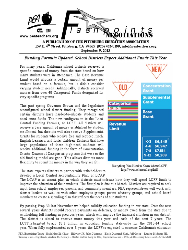 For many years, California school districts received a specific amount of money from the state based on how many students were in attendance. The Base Revenue Limit would allocate a certain amount of money per student based on a formula, but it didnt consider varying student needs. Additionally, districts received monies from over 40 Categorical Funds designated for very specific programs. This past spring Governor Brown and the legislature reconfigured school district funding. They recognized certain districts have harder-to-educate students and need extra funds. The new configuration is the Local Control Funding Formula, or LCFF. All districts will receive a base amount of money established by student enrollment, but districts will also receive Supplemental Grants for students who receive free and reduced lunch, English Learners, and foster children. Districts that have large populations of these high-need students will receive additional funding in the form of Concentration Grants. Dozens of Categorical programs that were in the old funding model are gone. This allows districts more flexibility to spend the money in the way they see fit. The state expects districts to partner with stakeholders to develop a Local Control Accountability Plan, or LCAP. The LCAP is an annual plan in which districts must indicate how they will spend LCFF funds to improve the education of their students. The first plan is due this March. Districts are required to seek input from school employees, parents, and community members. PEA representatives will work with district leaders as well as with other employee groups, parent advisory groups, and school board members to create a spending plan that reflects the needs of our students. By passing Prop 30 last November we helped solidify education funding in our state. Over the next several years districts should receive payments on deferrals, or money owed from the state due to withholding full funding in previous years, which will improve the financial situation in our district. The district is slated to receive more money this year and each of the next 7 years. The LCFF is targeted to add $2.1 billion in education funding state-wide for the 2013-14 school year. When fully implemented over 8 years, the LCFF is expected to increase California's education