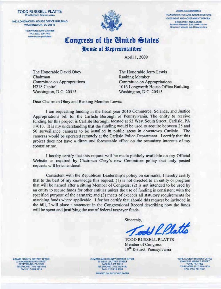 Dear Chairm an Obey and Ranking Member Lewis: