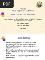 EARNED VALUE MANAGEMENT Earned Value Management is a methodology used to measure and communicate the real physical progress of a project taking into account the work complete, the time taken and the costs incurred to complete that work. Earned Value helps evaluate and control project risk by measuring project progress in monetary terms. We spend time, materials and in completing a task. If we are efficient, we complete the task with time to spare and with minimum wasted materials. If we are inefficient we take longer and waste materials. We also plan how we will accomplish the task. How long it will take, the resources we need and the estimated costs. By taking a snap-shot of the project and calculating the Earned Value we can compare the planned with the actual and make an objective assessment of the project progress. By extrapolating the curves and further calculation we can also estimate the costs to project completion and the probable completion date. Concept of Earned Value Measurement In the measurement of Earned Value, an attempt is made to differentiate value of work from the cost of work. Value is the worth of the activity for its final user who has agreed to pay certain cost against its delivery as per decided scope & specifications. The budgeted cost of the activity is therefore considered its value. Earned Value is based on the idea that the activity completion earns value equivalent to its budgeted cost. The value earned for the project at any point of time is therefore the total or cumulative budgeted cost of the tasks that are completed. And therefore, the Earned Value is a measure of the real progress of the project. If the actual cost incurred for its completion exceeds its estimated cost, it does not add any worth or value to the activity as long as the scope remains unchanged. This indicates cost over-run for such activities. On the other hand, if the project is running behind schedule, it will not be able to earn a cumulative value equivalent to the scheduled value that should have been earned for the given period. Earned Value therefore provides a standard means of objectively measuring work accomplished by integrating cost, schedule and technical performance into one set of metrics so that effective comparisons can be made. S Curves The basics of Earned Value can best be shown on the 'S-Curve'. The S-curve in its simplest form is a graph showing how project budget is planned to be spent over time. We further show the actual costs of doing the work over the same period. And also on the same graph we show how the value of the product of the project increases over the same period.
