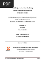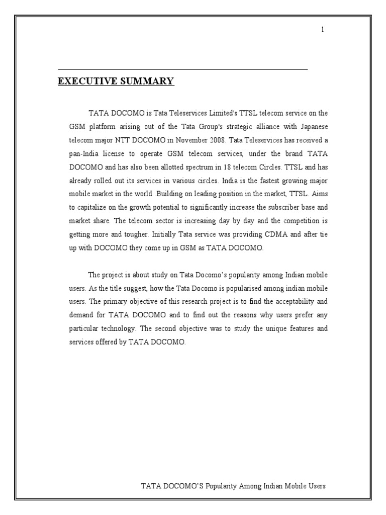 TATA DOCOMO is Tata Teleservices Limited's TTSL telecom service on the GSM platform arising out of the Tata Group's strategic alliance with Japanese telecom major NTT DOCOMO in November 2008. Tata Teleservices has received a pan-India license to operate GSM telecom services, under the brand TATA DOCOMO and has also been allotted spectrum in 18 telecom Circles. TTSL and has already rolled out its services in various circles. India is the fastest growing major mobile market in the world .Building on leading position in the market, TTSL. Aims to capitalize on the growth potential to significantly increase the subscriber base and market share. The telecom sector is increasing day by day and the competition is getting more and tougher. Initially Tata service was providing CDMA and after tie up with DOCOMO they come up in GSM as TATA DOCOMO. The project is about study on Tata Docomos popularity among Indian mobile users. As the title suggest, how the Tata Docomo is popularised among indian mobile users. The primary objective of this research project is to find the acceptability and demand for TATA DOCOMO and to find out the reasons why users prefer any particular technology. The second objective was to study the unique features and services offered by TATA DOCOMO.