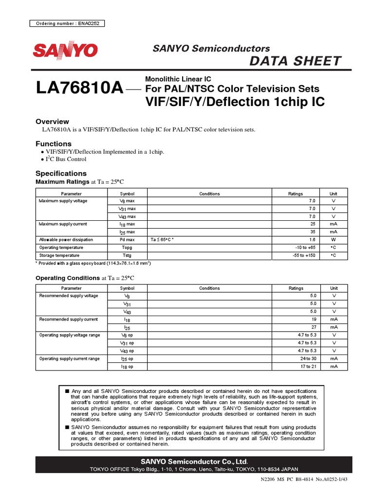LA76810A is a VIF/SIF/Y/Deflection 1chip IC for PAL/NTSC color television sets.
