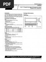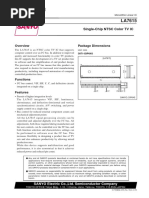 Continued from preceding page. Parameter Minimum AFT output voltage AFT detection sensitivity APC pull-in range (U) APC pull-in range (L) NT Trap1 (4.5MHz) NT Trap2 (4.8MHz) BG Trap1 (5.5MHz) BG Trap2 (5.85MHz) I Trap1 (6.0MHz) I Trap2 (6.55MHz) DK Trap1 (6.5MHz) NT Group Delay1 (3.5MHz) NT Group Delay2 (4.0MHz) BG Group Delay1 (4.0MHz) BG Group Delay2 (4.4MHz) I Group Delay1 (4.0MHz) I Group Delay2 (4.4MHz) DK Group Delay1 (4.0MHz) DK Group Delay2 (4.4MHz) [SIF block] FM detection output voltage FM limiting sensitivity FM detection output f characteristics FM detection output distortion AM rejection ratio SIF S/N PAL de-emph time constant PAL/NT difference of voltage gain TN de-emph time constant BPF 3dB band width [AUDIO block] Maximum gain Variable range Frequency characteristics Mute Distortion S/N Crosstalk [Video SW block] Video signal input 1DC voltage Video signal input 1AC voltage Video signal input 2DC voltage Video signal input 2AC voltage SVO terminal DC voltage SVO terminal AC voltage [Filter block] Chroma trap amount NTSC Chroma trap amount PAL C-BPF1A (3.93MHz) CtrapN CtrapP CBPF1A Reference: 4.43MHz FILTER SYS = 0010 Continued on next page. -36.0 -36.0 -6.0 -26.0 -26.0 -3.0 -22.0 -22.0 0.0 dB dB dB VIN1DC VIN1AC VIN2DC VIN2AC SVODC SVOAC 1.7 1.7 2.2 2.2 2.5 1 2.5 1 2 2 2.3 2.3 2.8 2.8 V Vp-p V Vp-p V Vp-p AGMAX ARANGE AF AMUTE ATHD ASN ACT 20kHz 20kHz 1kHz, 500mVrms, Vol: MAX DIN.Audio 20kHz 65 70 70 1kHz -2.5 60 -3.0 70 0.0 65 3.0 0.5 2.5 dB dB dB dB % dB dB STHD SAMR SSN SPTC SGD SNTC SBW FM = 30kHz AM = 30% DIN.Andio 40 50 3.0 0.0 3.0 3.0 1.0 % dB dB dB dB dB dB SOADJ SLS SF Output -3dB fm = 100kHz -0.5 6.0 580 600 620 61 9.0 mVrms dB dB Symbol VAFTL VAFTS fPU fPL NTR1 NTR2 BTR1 BTR2 ITR1 ITR2 DTR1 NGD1 NGD2 BGD1 BGD2 IGD1 IGD2 DGD1 DGD2 for 1MHz for 1MHz for 1MHz for 1MHz for 1MHz for 1MHz for 1MHz for 1MHz for 1MHz for 1MHz for 1MHz for 1MHz for 1MHz for 1MHz for 1MHz Conditions CW = 80dB, frequency variations CW = 80dB, frequency variations Ratings min 0.0 12.0 1.0 1.0 -35 -20 -35 -20 -35 -20 -35 200 700 100 200 50 90 30 40 typ 0.2 20.0 max 0.7 28.0 Unit Vdc mV/kHz MHz MHz dB dB dB dB dB dB dB ns ns ns ns ns ns ns ns