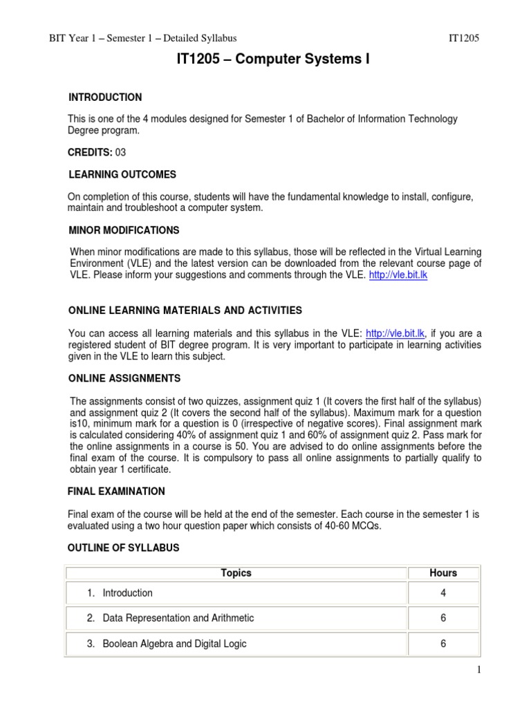 INTRODUCTION This is one of the 4 modules designed for Semester 1 of Bachelor of Information Technology Degree program. CREDITS: 03 LEARNING OUTCOMES On completion of this course, students will have the fundamental knowledge to install, configure, maintain and troubleshoot a computer system. MINOR MODIFICATIONS When minor modifications are made to this syllabus, those will be reflected in the Virtual Learning Environment (VLE) and the latest version can be downloaded from the relevant course page of VLE. Please inform your suggestions and comments through the VLE. http://vle.bit.lk