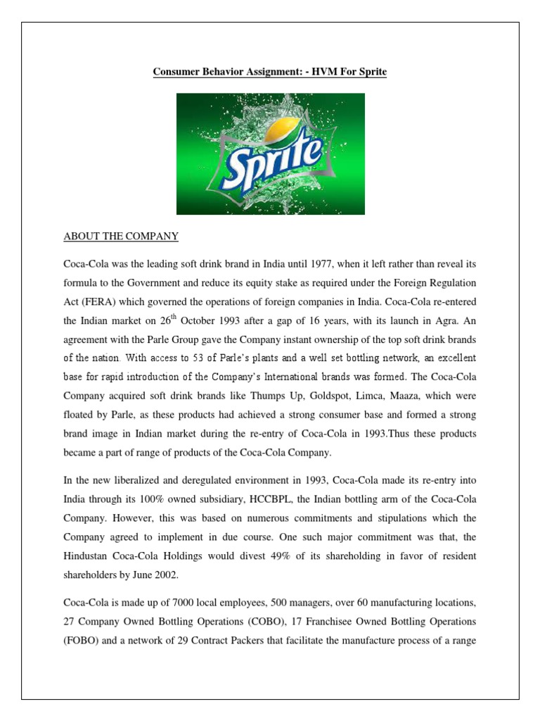 ABOUT THE COMPANY Coca-Cola was the leading soft drink brand in India until 1977, when it left rather than reveal its formula to the Government and reduce its equity stake as required under the Foreign Regulation Act (FERA) which governed the operations of foreign companies in India. Coca-Cola re-entered the Indian market on 26th October 1993 after a gap of 16 years, with its launch in Agra. An agreement with the Parle Group gave the Company instant ownership of the top soft drink brands of the nation. With access to 53 of Parles plants and a well set bottling network, an excellent base for rapid introduction of the Companys International brands was formed. The Coca-Cola Company acquired soft drink brands like Thumps Up, Goldspot, Limca, Maaza, which were floated by Parle, as these products had achieved a strong consumer base and formed a strong brand image in Indian market during the re-entry of Coca-Cola in 1993.Thus these products became a part of range of products of the Coca-Cola Company. In the new liberalized and deregulated environment in 1993, Coca-Cola made its re-entry into India through its 100% owned subsidiary, HCCBPL, the Indian bottling arm of the Coca-Cola Company. However, this was based on numerous commitments and stipulations which the Company agreed to implement in due course. One such major commitment was that, the Hindustan Coca-Cola Holdings would divest 49% of its shareholding in favor of resident shareholders by June 2002. Coca-Cola is made up of 7000 local employees, 500 managers, over 60 manufacturing locations, 27 Company Owned Bottling Operations (COBO), 17 Franchisee Owned Bottling Operations (FOBO) and a network of 29 Contract Packers that facilitate the manufacture process of a range
