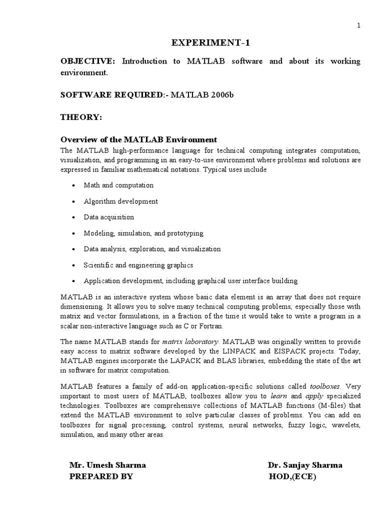 OBJECTIVE: Introduction to MATLAB software and about its working environment. SOFTWARE REQUIRED:- MATLAB 2006b THEORY: Overview of the MATLAB Environment