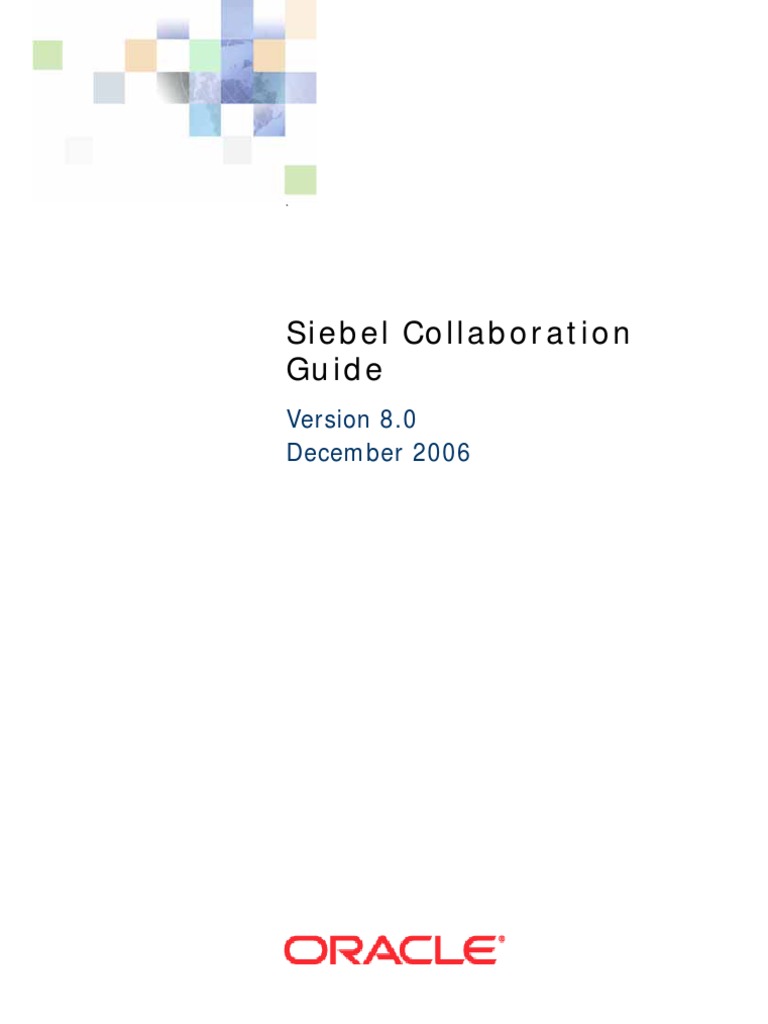Copyright 2005, 2006, Oracle. All rights reserved. The Programs (which include both the software and documentation) contain proprietary information; they are provided under a license agreement containing restrictions on use and disclosure and are also protected by copyright, patent, and other intellectual and industrial property laws. Reverse engineering, disassembly, or decompilation of the Programs, except to the extent required to obtain interoperability with other independently created software or as specified by law, is prohibited. The information contained in this document is subject to change without notice. If you find any problems in the documentation, please report them to us in writing. This document is not warranted to be errorfree. Except as may be expressly permitted in your license agreement for these Programs, no part of these Programs may be reproduced or transmitted in any form or by any means, electronic or mechanical, for any purpose. PRODUCT MODULES AND OPTIONS. This guide contains descriptions of modules that are optional and for which you may not have purchased a license. Siebels Sample Database also includes data related to these optional modules. As a result, your software implementation may differ from descriptions in this guide. To find out more about the modules your organization has purchased, see your corporate purchasing agent or your Siebel sales representative. If the Programs are delivered to the United States Government or anyone licensing or using the Programs on behalf of the United States Government, the following notice is applicable: U.S. GOVERNMENT RIGHTS. Programs, software, databases, and related documentation and technical data delivered to U.S. Government customers are "commercial computer software" or "commercial technical data" pursuant to the applicable Federal Acquisition Regulation and agency-specific supplemental regulations. As such, use, duplication, disclosure, modification, and adaptation of the Programs, including documentation and technical data, shall be subject to the licensing restrictions set forth in the applicable Oracle license agreement, and, to the extent applicable, the additional rights set forth in FAR 52.227-19, Commercial Computer Software--Restricted Rights (June 1987). Oracle USA, Inc., 500 Oracle Parkway, Redwood City, CA 94065. The Programs are not intended for use in any nuclear, aviation, mass transit, medical, or other inherently dangerous applications. It shall be the licensee's responsibility to take all appropriate fail-safe, backup, redundancy and other measures to ensure the safe use of such applications if the Programs are used for such purposes, and we disclaim liability for any damages caused by such use of the Programs. Oracle, JD Edwards, PeopleSoft, and Siebel are registered trademarks of Oracle Corporation and/or its affiliates. Other names may be trademarks of their respective owners. The Programs may provide links to Web sites and access to content, products, and services from third parties. Oracle is not responsible for the availability of, or any content provided on, third-party Web sites. You bear all risks associated with the use of such content. If you choose to purchase any products or services from a third party, the relationship is directly between you and the third party. Oracle is not responsible for: (a) the quality of third-party products or services; or (b) fulfilling any of the terms of the agreement with the third party, including delivery of products or services and warranty obligations related to purchased products or services. Oracle is not responsible for any loss or damage of any sort that you may incur from dealing with any third party.