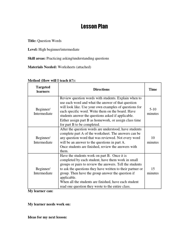 Method (How will I teach it?): Targeted learners Directions Review question words with students. Explain when to use each word and what the answer of that question will look like. Use your own examples of questions for each specific word. Write them on the board. Have students answer the questions asked if applicable. Either assign part B as homework, or assign class time for part B to be completed. After the question words are understood, have students complete part A of the worksheet. The answers can be any question word that was reviewed. Not every word will be an answer to the questions in part A. Once students are finished, review the answers with them. Have the students work on part B. Once it is completed by each student, have them work in small groups or pairs to review the answers. Tell the students to ask the questions they have written to their partner or group. Then have the group answer the question if applicable. When all the students are finished, have each student read one question they wrote to the entire class. Time