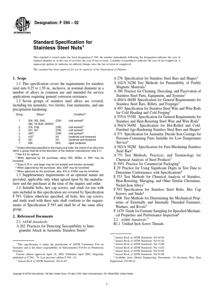 1. Scope 1.1 This specication covers the requirements for stainless steel nuts 0.25 to 1.50 in., inclusive, in nominal diameter in a number of alloys in common use and intended for service applications requiring general corrosion resistance. 1.2 Seven groups of stainless steel alloys are covered, including ten austenitic, two ferritic, four martensitic, and one precipitation hardening.