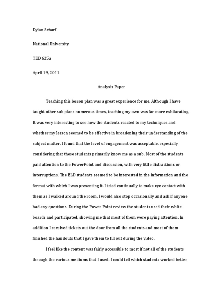 Dylan Scharf National University TED 625a April 19, 2011 Analysis Paper Teaching this lesson plan