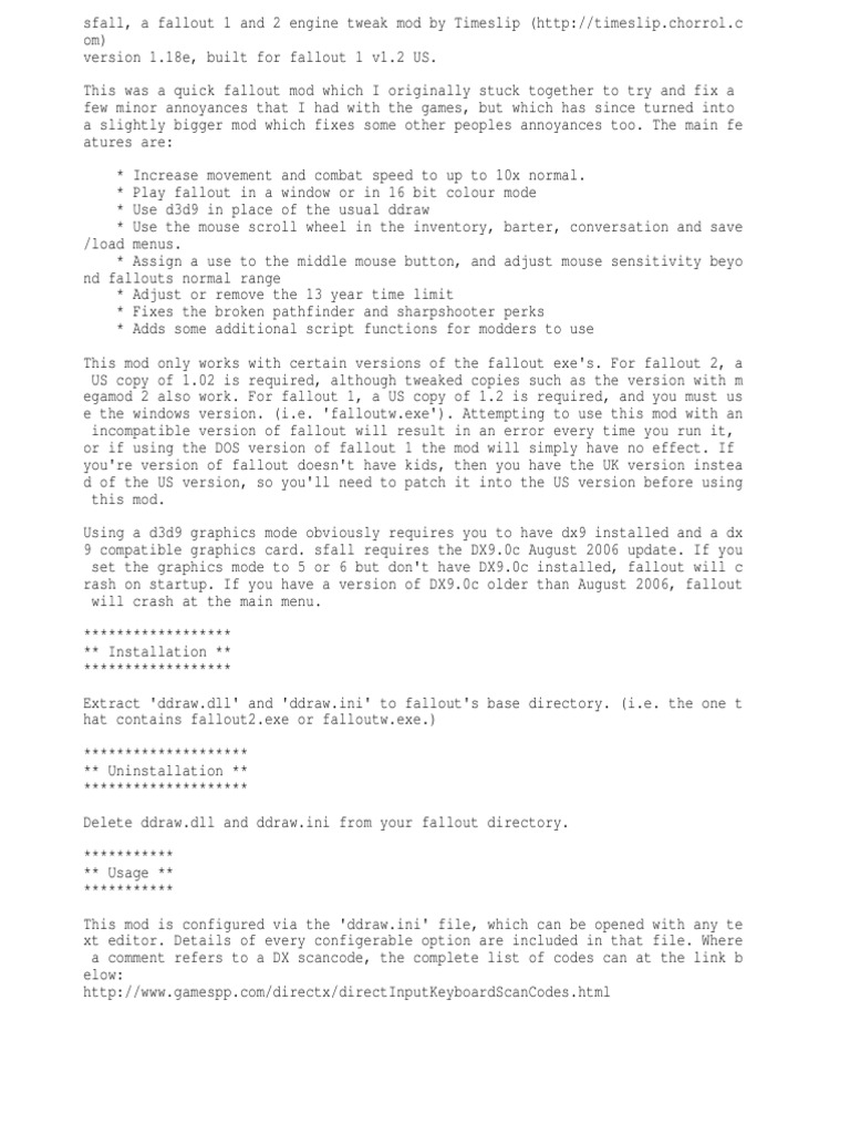 2 US. This was a quick fallout mod which I originally stuck together to try and fix a few minor annoyances that I had with the games, but which has since turned into a slightly bigger mod which fixes some other peoples annoyances too. The main fe atures are: * Increase movement and combat speed to up to 10x normal. * Play fallout in a window or in 16 bit colour mode * Use d3d9 in place of the usual ddraw * Use the mouse scroll wheel in the inventory, barter, conversation and save /load menus. * Assign a use to the middle mouse button, and adjust mouse sensitivity beyo nd fallouts normal range * Adjust or remove the 13 year time limit * Fixes the broken pathfinder and sharpshooter perks * Adds some additional script functions for modders to use This mod only works with certain versions of the fallout exe's. For fallout 2, a US copy of 1.02 is required, although tweaked copies such as the version with m egamod 2 also work. For fallout 1, a US copy of 1.2 is required, and you must us e the windows version. (i.e. 'falloutw.exe'). Attempting to use this mod with an incompatible version of fallout will result in an error every time you run it, or if using the DOS version of fallout 1 the mod will simply have no effect. If you're version of fallout doesn't have kids, then you have the UK version instea d of the US version, so you'll need to patch it into the US version before using this mod. Using a d3d9 graphics mode obviously requires you to have dx9 installed and a dx 9 compatible graphics card. sfall requires the DX9.0c August 2006 update. If you set the graphics mode to 5 or 6 but don't have DX9.0c installed, fallout will c rash on startup. If you have a version of DX9.0c older than August 2006, fallout will crash at the main menu. ****************** ** Installation ** ****************** Extract 'ddraw.dll' and 'ddraw.ini' to fallout's base directory. (i.e. the one t hat contains fallout2.exe or falloutw.exe.) ******************** ** Uninstallation ** ******************** Delete ddraw.dll and ddraw.ini from your fallout directory. *********** ** Usage ** *********** This mod is configured via the 'ddraw.ini' file, which can be opened with any te xt editor. Details of every configerable option are included in that file. Where a comment refers to a DX scancode, the complete list of codes can at the link b elow: http://www.gamespp.com/directx/directInputKeyboardScanCodes.html