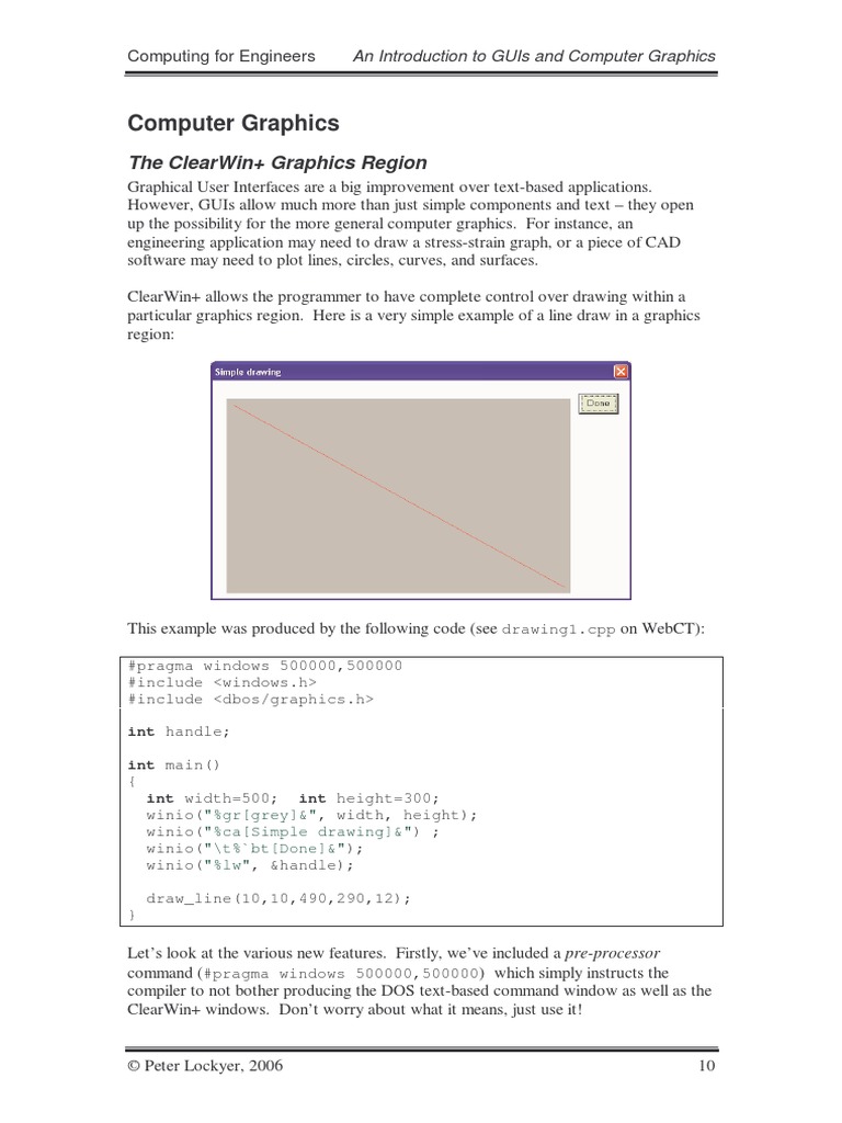 Graphical User Interfaces are a big improvement over text-based applications. However, GUIs allow much more than just simple components and text they open up the possibility for the more general computer graphics. For instance, an engineering application may need to draw a stress-strain graph, or a piece of CAD software may need to plot lines, circles, curves, and surfaces. ClearWin+ allows the programmer to have complete control over drawing within a particular graphics region. Here is a very simple example of a line draw in a graphics region: