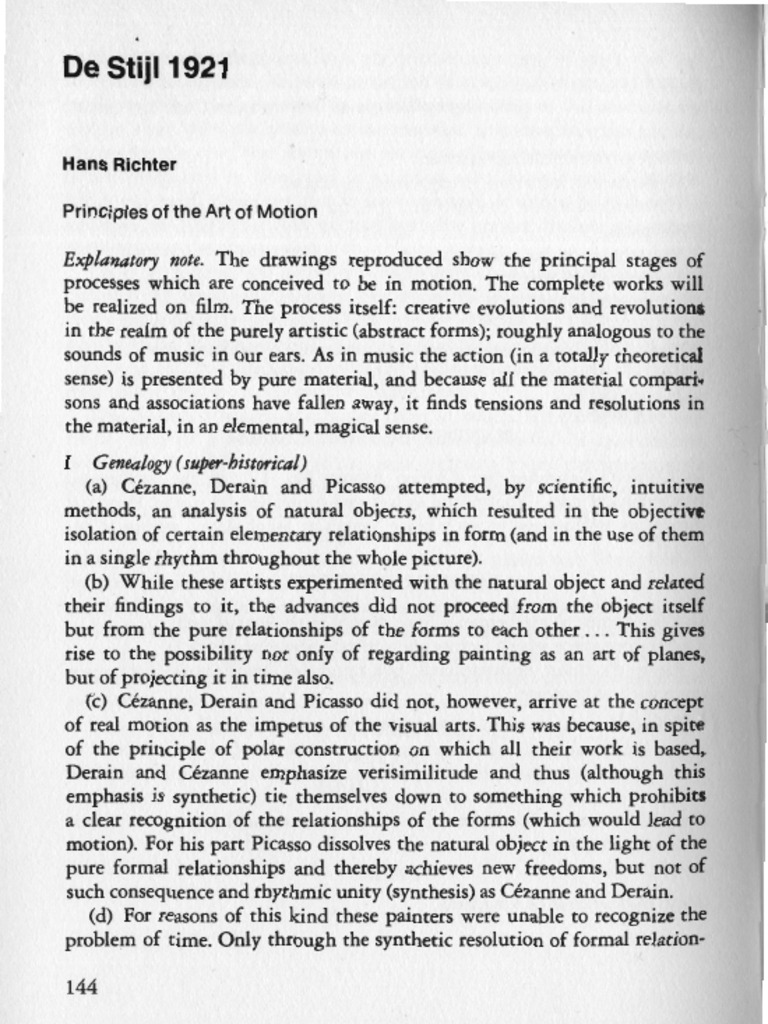 Genealogy (super-historical) (a) Cezanne, Derain and Picasso attempted, by scientific, intuitive methods, an analysis of natural objects, which resulted in the objective isolation of certain elementary relationships in form (and in the use of them in a single rhythm throughout the whole picture). (b) While these artists experimented with the natural object and related their findings to it, the advances did not proceed from the object itself but from the pure relationships of the forms to each other .. . This gives rise to the possibility not only of regarding painting as an art of planes, but of projecting it in time also. (c) Cezanne, Derain and Picasso did not, however, arrive at the concept of real motion as the impetus of the visual arts. This was because, in spite of the principle of polar construction on which all their work is based. Derain and Cezanne emphasize verisimilitude and thus (although this emphasis is synthetic) tie themselves down to something which prohibits a clear recognition of the relationships of the forms (which would lead to motion). For his part Picasso dissolves the natural object in the light of the pure formal relationships and thereby achieves new freedoms, but not of such consequence and rhythmic unity (synthesis) as Cezanne and Derain. (d) For reasons of this kind these painters were unable to recognize the problem of time. Only through the synthetic resolution of formal relation-