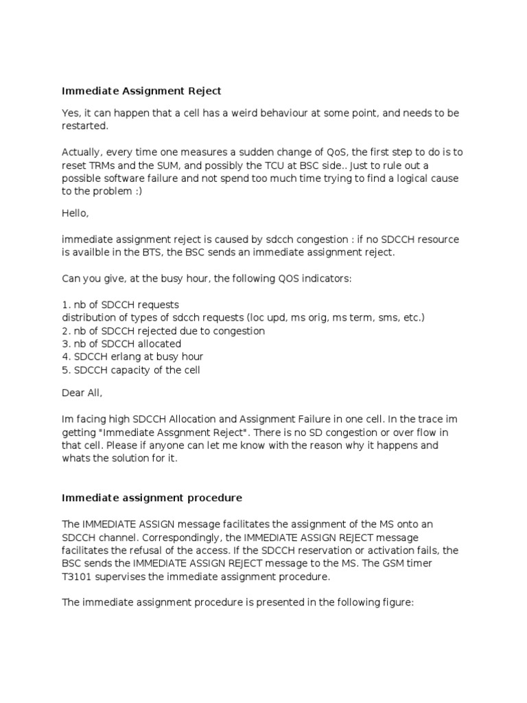 to be restarted. Actually, every time one measures a sudden change of QoS, the first step to do is to reset TRMs and the SUM, and possibly the TCU at BSC side.. Just to rule out a possible software failure and not spend too much time trying to find a logical cause to the problem :) Hello, immediate assignment reject is caused by sdcch congestion : if no SDCCH resource is availble in the BTS, the BSC sends an immediate assignment reject. Can you give, at the busy hour, the following QOS indicators: 1. nb of SDCCH requests distribution of types of sdcch requests (loc upd, ms orig, ms term, sms, etc.) 2. nb of SDCCH rejected due to congestion 3. nb of SDCCH allocated 4. SDCCH erlang at busy hour 5. SDCCH capacity of the cell Dear All, Im facing high SDCCH Allocation and Assignment Failure in one cell. In the trace im getting "Immediate Assgnment Reject". There is no SD congestion or over flow in that cell. Please if anyone can let me know with the reason why it happens and whats the solution for it.