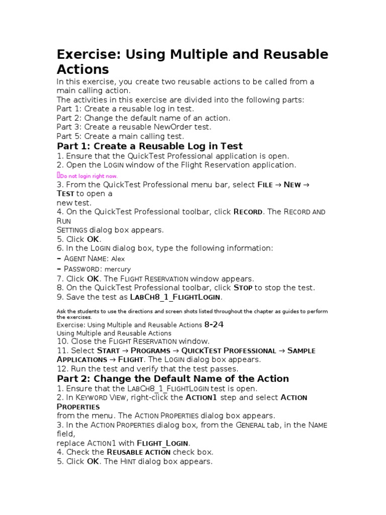 In this exercise, you create two reusable actions to be called from a main calling action. The activities in this exercise are divided into the following parts: Part 1: Create a reusable log in test. Part 2: Change the default name of an action. Part 3: Create a reusable NewOrder test. Part 5: Create a main calling test.