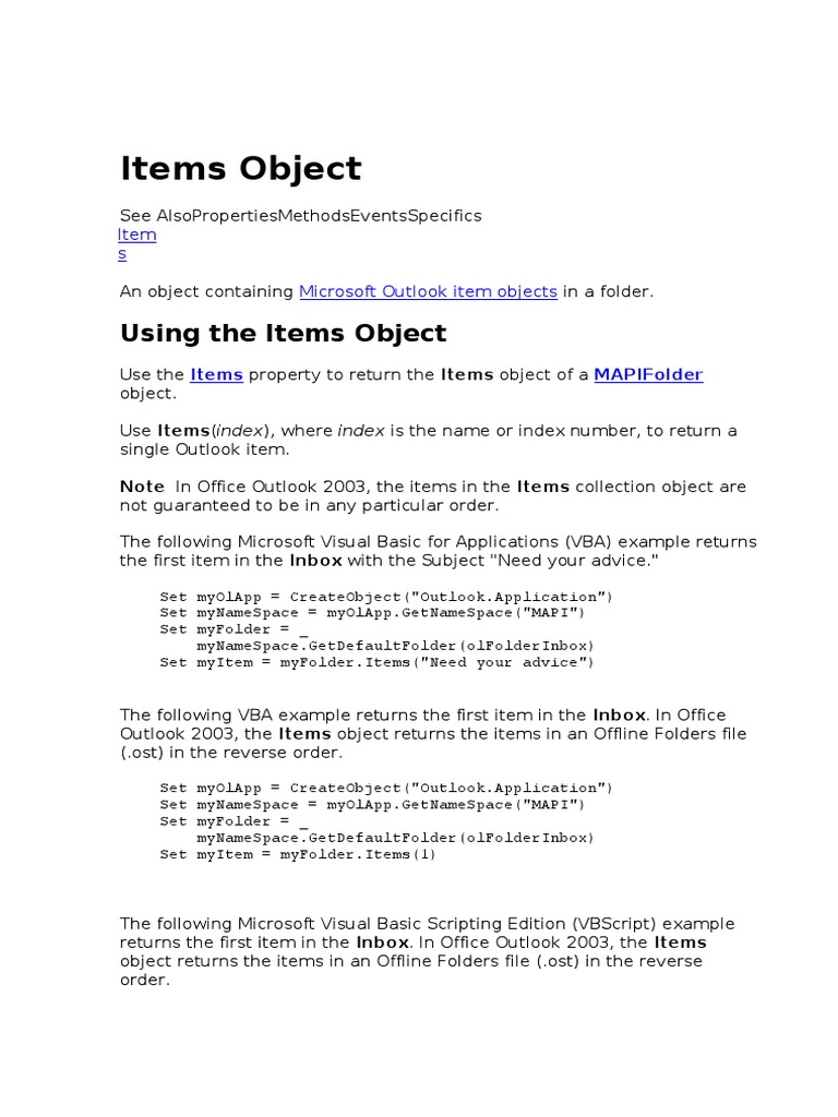 Use the Items property to return the Items object of a MAPIFolder object. Use Items(index), where index is the name or index number, to return a single Outlook item. Note In Office Outlook 2003, the items in the Items collection object are not guaranteed to be in any particular order. The following Microsoft Visual Basic for Applications (VBA) example returns the first item in the Inbox with the Subject "Need your advice."