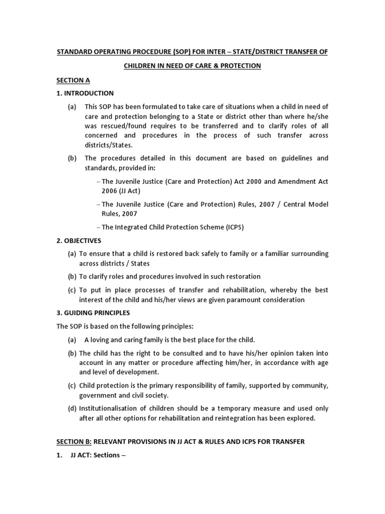 . INTRODUCTION (a) This SOP has been formulated to take care of situations when a child in need of care and protection belonging to a State or district other than where he/she was rescued/found requires to be transferred and to clarify roles of all concerned and procedures in the process of such transfer across districts/States. The procedures detailed in this document are based on guidelines and standards, provided in: - The Juvenile Justice (Care and Protection) Act 2000 and Amendment Act 2006 (JJ Act) - The Juvenile Justice (Care and Protection) Rules, 2007 / Central Model Rules, 2007 - The Integrated Child Protection Scheme (ICPS) 2. OBJECTIVES (a) To ensure that a child is restored back safely to family or a familiar surrounding across districts / States (b) To clarify roles and procedures involved in such restoration (c) To put in place processes of transfer and rehabilitation, whereby the best interest of the child and his/her views are given paramount consideration 3. GUIDING PRINCIPLES The SOP is based on the following principles: (a) A loving and caring family is the best place for the child.